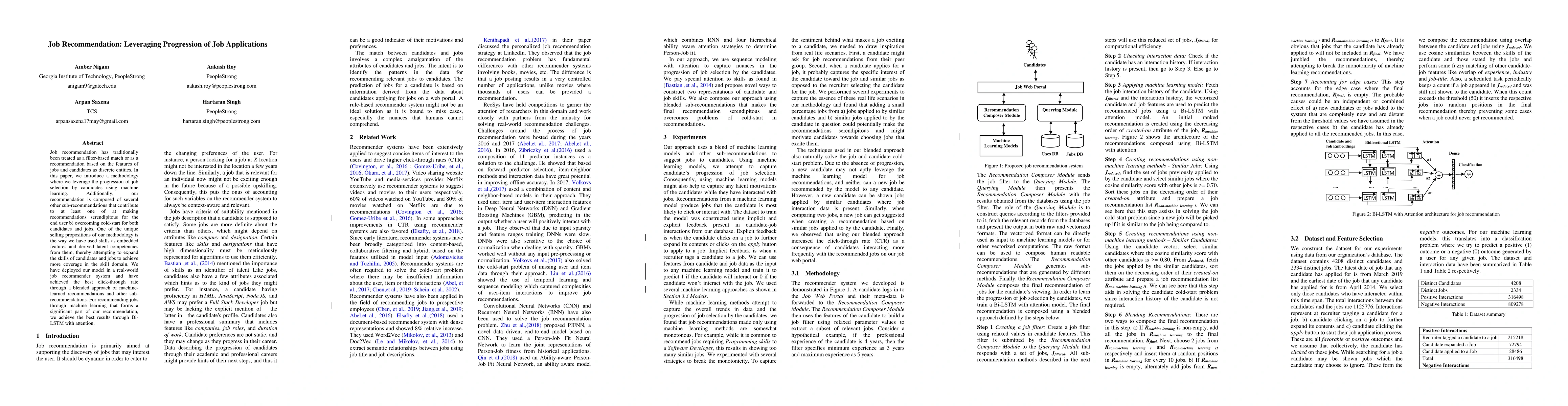 This paper proposes a novel job recommendation methodology leveraging machine learning to analyze the progression of job selection by candidates. It enhances recommendations through serendipity and cold-start solutions, using skills as embedded features to derive latent competencies, achieving superior click-through rates with a blended approach and Bi-LSTM with attention.