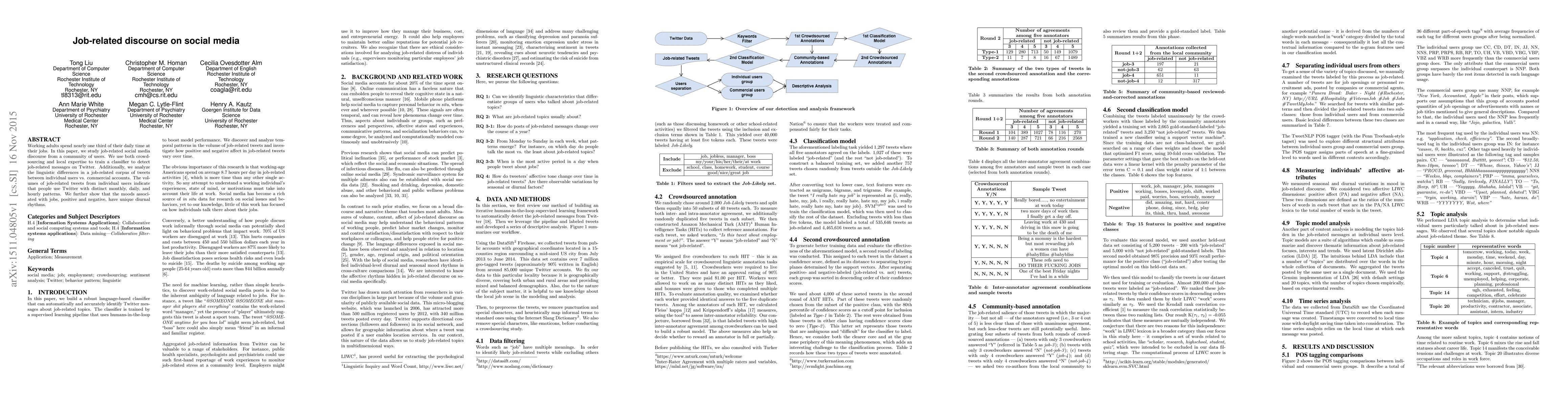 Working adults spend nearly one third of their daily time at their jobs. In this paper, we study job-related social media discourse from a community of users. We use both crowdsourcing and local expertise to train a classifier to detect job-related messages on Twitter. Additionally, we analyze the linguistic differences in a job-related corpus of tweets between individual users vs. commercial accounts. The volumes of job-related tweets from individual users indicate that people use Twitter with distinct monthly, daily, and hourly patterns. We further show that the moods associated with jobs, positive and negative, have unique diurnal rhythms.