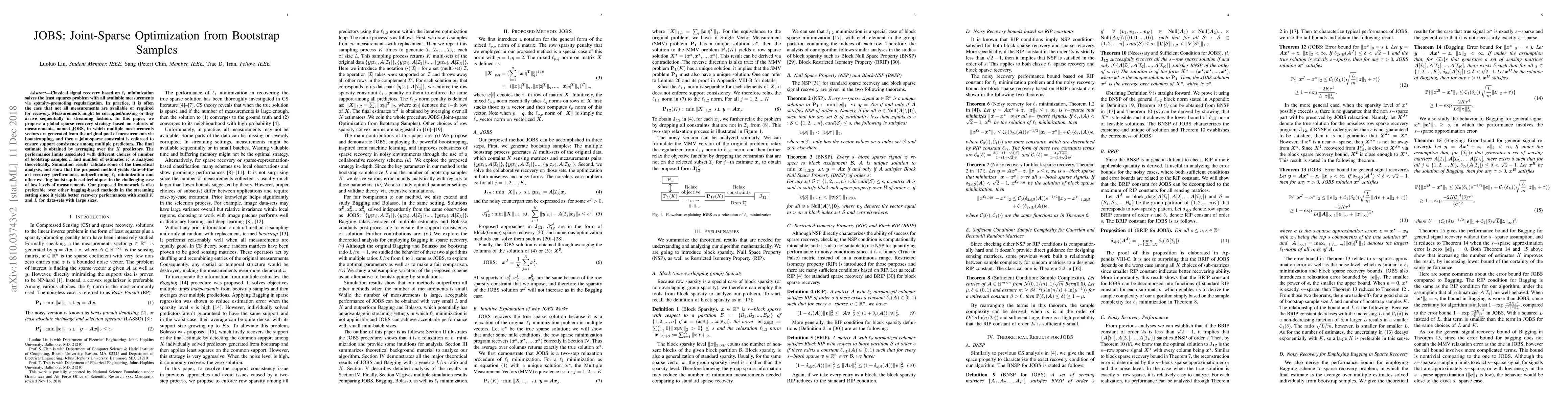 Classical signal recovery based on $\ell_1$ minimization solves the least squares problem with all available measurements via sparsity-promoting regularization. In practice, it is often the case that not all measurements are available or required for recovery. Measurements might be corrupted/missing or they arrive sequentially in streaming fashion. In this paper, we propose a global sparse recovery strategy based on subsets of measurements, named JOBS, in which multiple measurements vectors are generated from the original pool of measurements via bootstrapping, and then a joint-sparse constraint is enforced to ensure support consistency among multiple predictors. The final estimate is obtained by averaging over the $K$ predictors. The performance limits associated with different choices of number of bootstrap samples $L$ and number of estimates $K$ is analyzed theoretically. Simulation results validate some of the theoretical analysis, and show that the proposed method yields state-of-the-art recovery performance, outperforming $\ell_1$ minimization and a few other existing bootstrap-based techniques in the challenging case of low levels of measurements and is preferable over other bagging-based methods in the streaming setting since it performs better with small $K$ and $L$ for data-sets with large sizes.