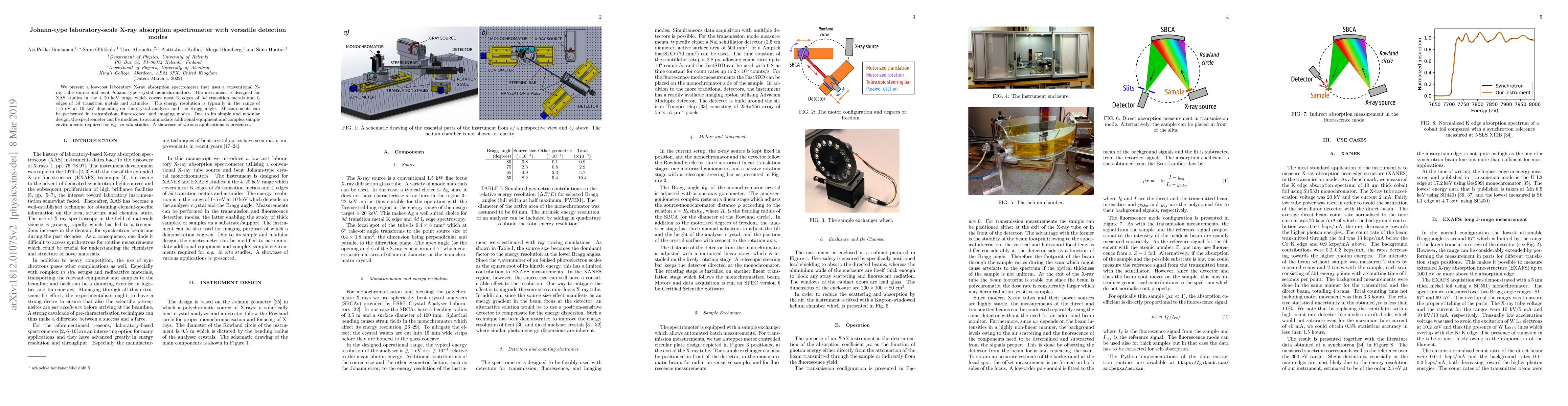 We present a low-cost laboratory X-ray absorption spectrometer that uses a conventional X-ray tube source and bent Johann-type crystal monochromators. The instrument is designed for XAS studies in the 4-20 keV range which covers most K edges of 3d transition metals and L edges of 5d transition metals and actinides. The energy resolution is typically in the range of 1-5 eV at 10 keV depending on the crystal analyser and the Bragg angle. Measurements can be performed in transmission, fluorescence, and imaging modes. Due to its simple and modular design, the spectrometer can be modified to accommodate additional equipment and complex sample environments required for e.g. in situ studies. A showcase of various applications is presented.