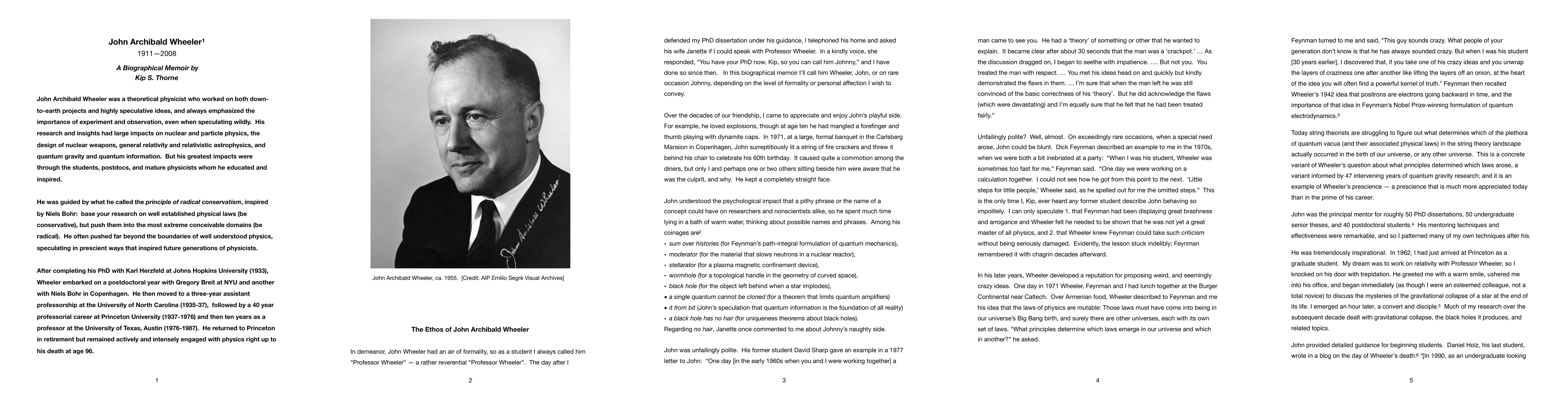 John Archibald Wheeler was a pioneering theoretical physicist whose work profoundly influenced nuclear and particle physics, general relativity, and quantum gravity. His career, marked by a principle of radical conservatism, inspired many physicists and left a lasting legacy through his mentorship.