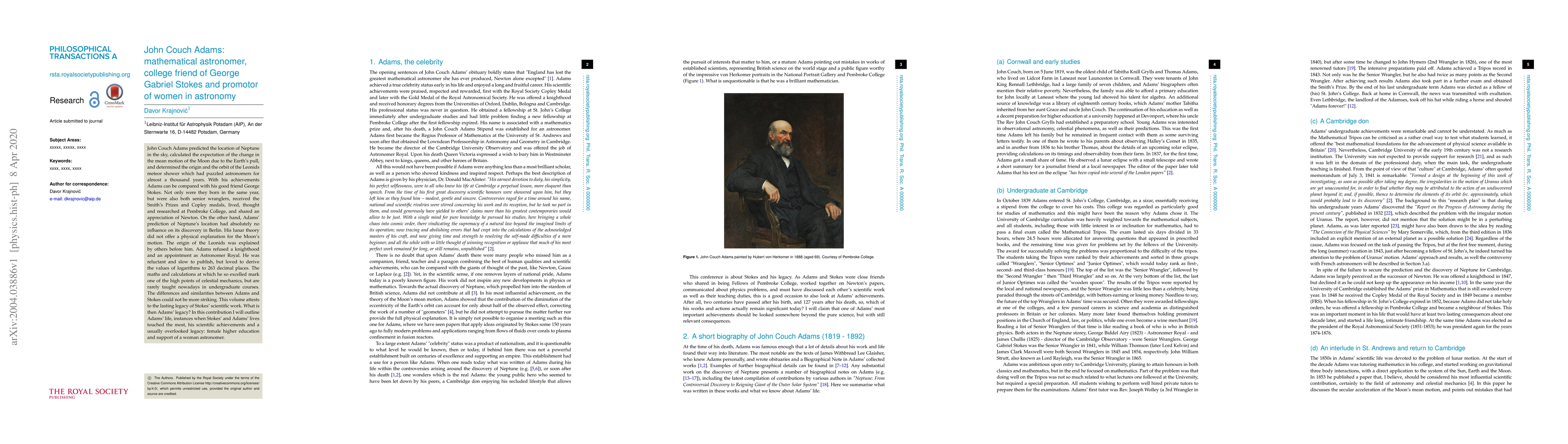John Couch Adams predicted the location of Neptune in the sky, calculated the expectation of the change in the mean motion of the Moon due to the Earth's pull, and determined the origin and the orbit of the Leonids meteor shower which had puzzled astronomers for almost a thousand years. With his achievements Adams can be compared with his good friend George Stokes. Not only were they born in the same year, but were also both senior wranglers, received the Smith's Prizes and Copley medals, lived, thought and researched at Pembroke College, and shared an appreciation of Newton. On the other hand, Adams' prediction of Neptune's location had absolutely no influence on its discovery in Berlin. His lunar theory did not offer a physical explanation for the Moon's motion. The origin of the Leonids was explained by others before him. Adams refused a knighthood and an appointment as Astronomer Royal. He was reluctant and slow to publish, but loved to derive the values of logarithms to 263 decimal places. The maths and calculations at which he so excelled mark one of the high points of celestial mechanics, but are rarely taught nowadays in undergraduate courses. The differences and similarities between Adams and Stokes could not be more striking. This volume attests to the lasting legacy of Stokes' scientific work. What is then Adams' legacy? In this contribution I will outline Adams' life, instances when Stokes' and Adams' lives touched the most, his scientific achievements and a usually overlooked legacy: female higher education and support of a woman astronomer.