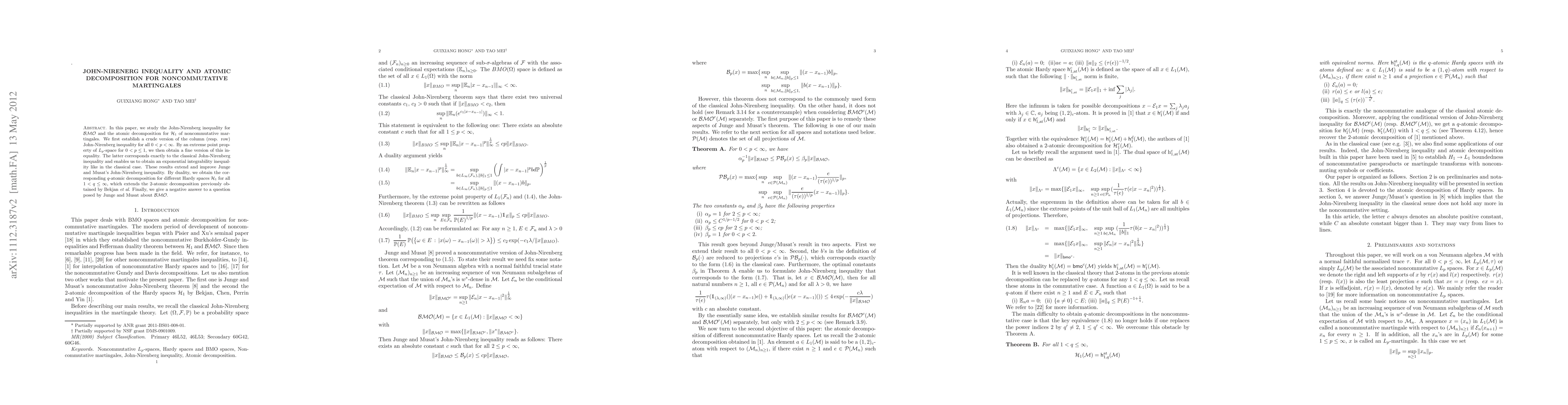 This paper establishes refined versions of the John-Nirenberg inequality for BMO and provides a q-atomic decomposition for Hardy spaces H1 of noncommutative martingales, extending previous results. It also answers a question posed by Junge and Musat negatively regarding BMO.