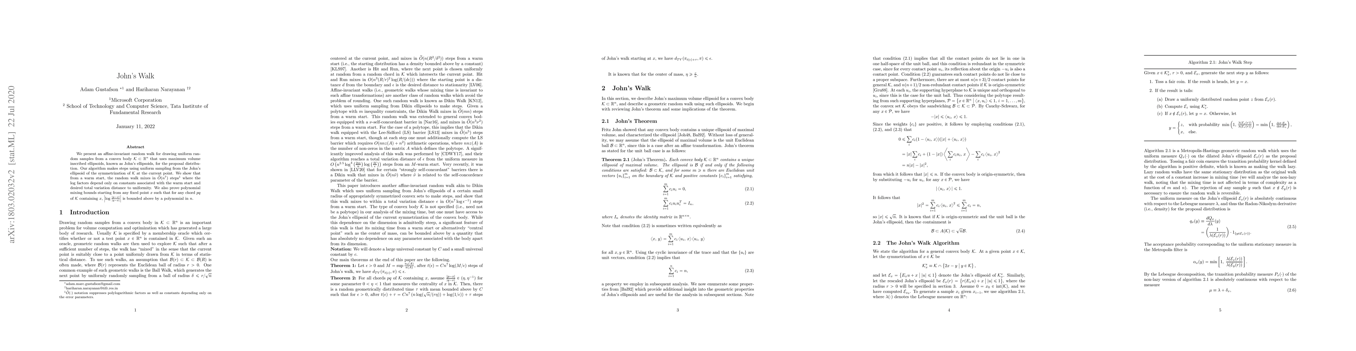 Summary: This paper introduces an affine-invariant random walk algorithm that samples uniformly from convex bodies using John's ellipsoids. The algorithm shows polynomial mixing time starting from any fixed point under certain conditions, with warm start mixing in $\widetilde{O}(n^7)$ steps.