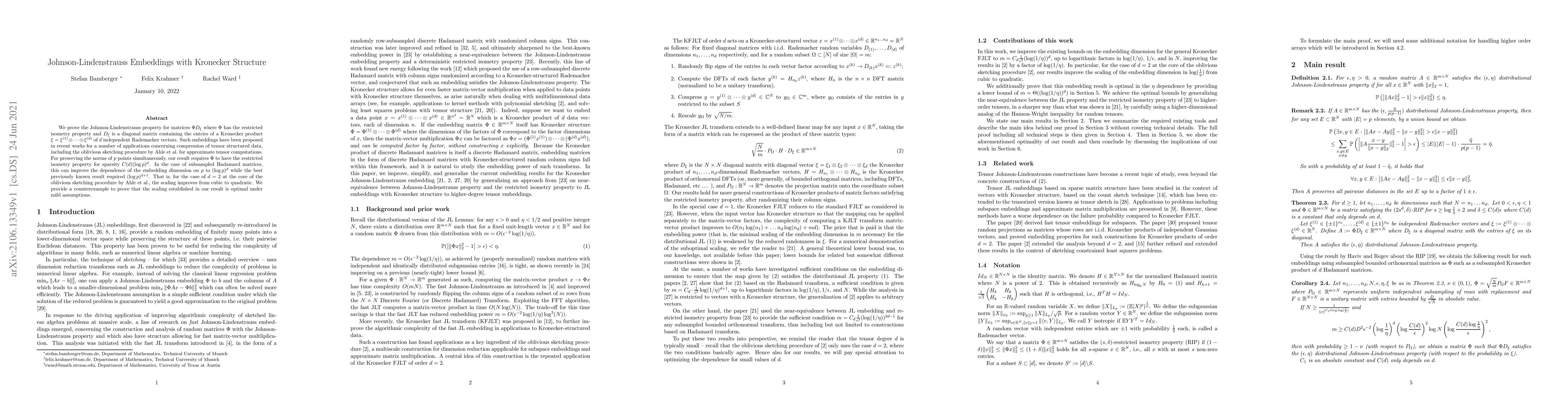The paper establishes the Johnson-Lindenstrauss property for matrices with Kronecker structure, improving the embedding dimension for Hadamard matrices from (log p)^(d + 1) to (log p)^d.