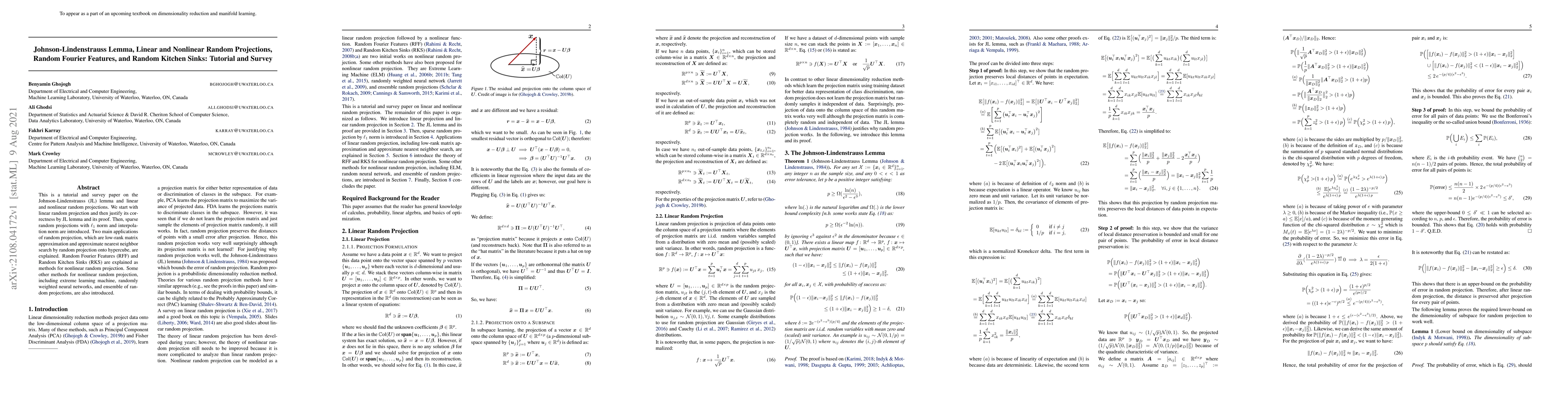 This paper provides a comprehensive tutorial and survey on the Johnson-Lindenstrauss Lemma and various random projection techniques, including linear and nonlinear methods, with applications in low-rank matrix approximation and approximate nearest neighbor search, and introduces advanced nonlinear methods like Random Fourier Features and Random Kitchen Sinks.
