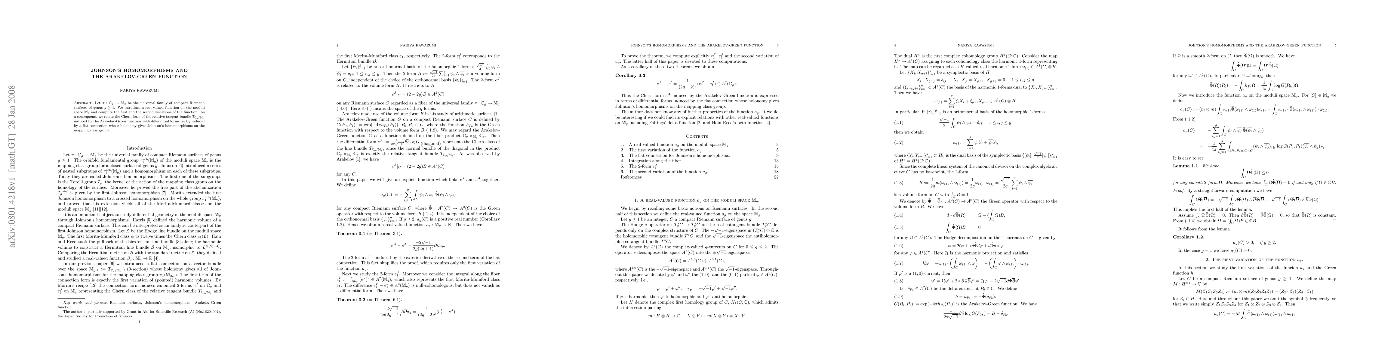 The paper introduces a real-valued function on the moduli space of compact Riemann surfaces and relates its variations to differential forms induced by flat connections, connecting Johnson's homomorphisms to Arakelov-Green functions.