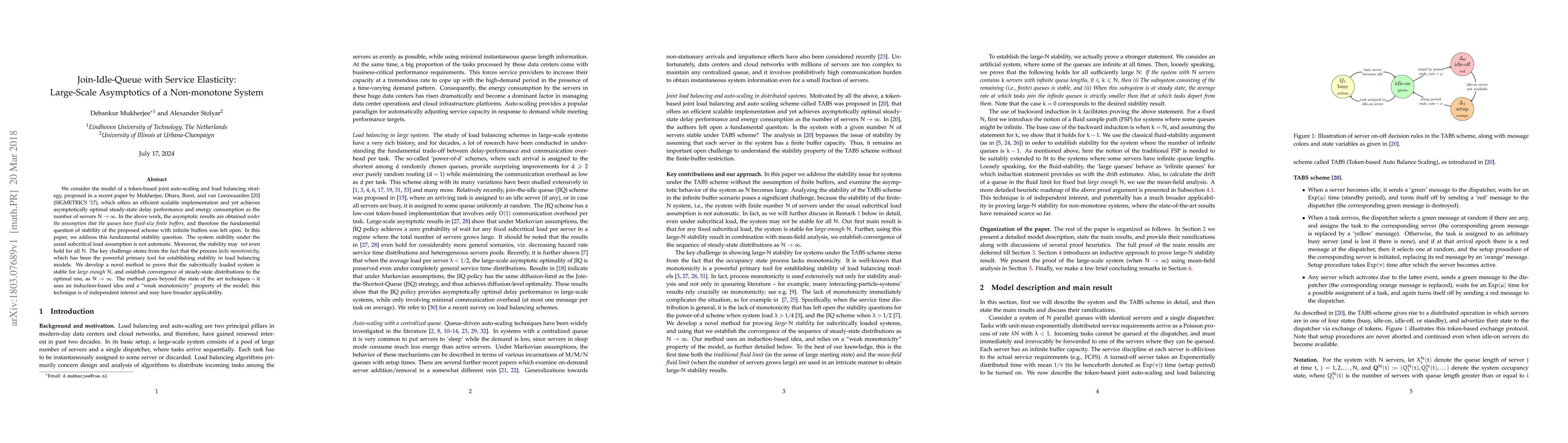 Researchers develop a method to prove stability of a token-based joint auto-scaling and load balancing strategy for large-scale systems with infinite buffers, establishing convergence to optimal steady-state performance as the number of servers approaches infinity.