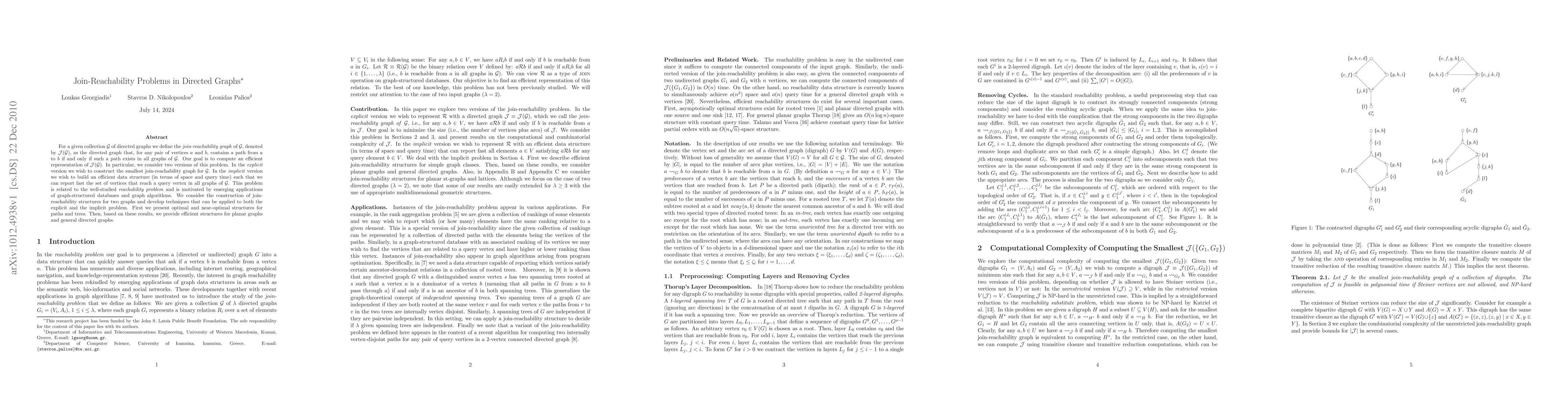 This paper investigates join-reachability problems in directed graphs, focusing on constructing efficient representations for the join-reachability graph, which indicates path existence across multiple graphs. It develops optimal and near-optimal structures for paths, trees, and extends the approach to planar and general directed graphs.