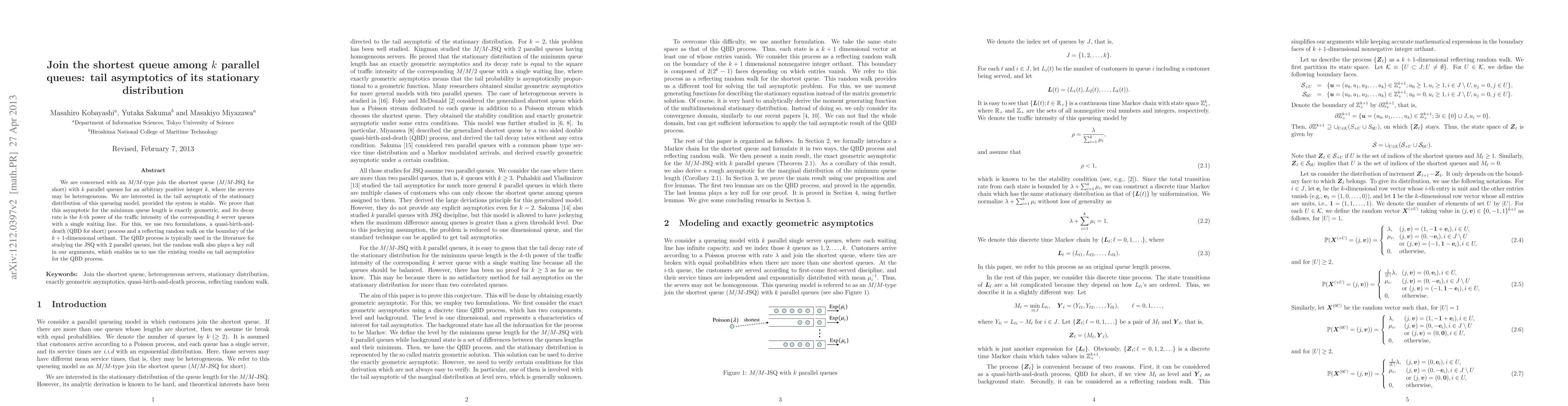 We are concerned with an $M/M$-type join the shortest queue ($M/M$-JSQ for short) with $k$ parallel queues for an arbitrary positive integer $k$, where the servers may be heterogeneous. We are interested in the tail asymptotic of the stationary distribution of this queueing model, provided the system is stable. We prove that this asymptotic for the minimum queue length is exactly geometric, and its decay rate is the $k$-th power of the traffic intensity of the corresponding $k$ server queues with a single waiting line. For this, we use two formulations, a quasi-birth-and-death (QBD for short) process and a reflecting random walk on the boundary of the $k+1$-dimensional orthant. The QBD process is typically used in the literature for studying the JSQ with 2 parallel queues, but the random walk also plays a key roll in our arguments, which enables us to use the existing results on tail asymptotics for the QBD process.