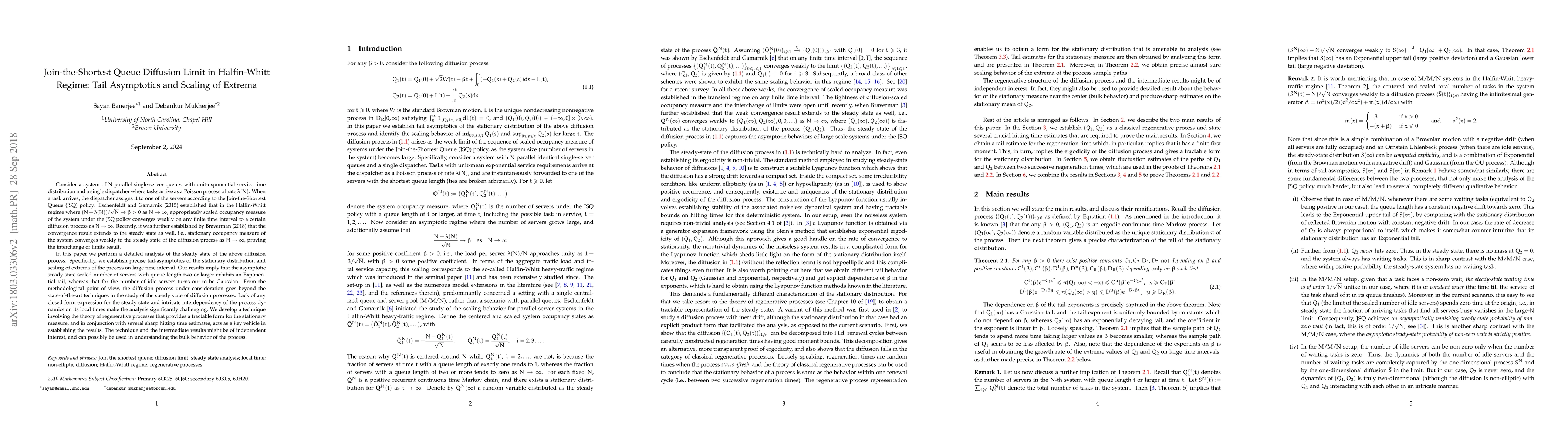Consider a system of $N$ parallel single-server queues with unit-exponential service time distribution and a single dispatcher where tasks arrive as a Poisson process of rate $\lambda(N)$. When a task arrives, the dispatcher assigns it to one of the servers according to the Join-the-Shortest Queue (JSQ) policy. Eschenfeldt and Gamarnik (2015) established that in the Halfin-Whitt regime where $(N-\lambda(N))/\sqrt{N}\to\beta>0$ as $N\to\infty$, appropriately scaled occupancy measure of the system under the JSQ policy converges weakly on any finite time interval to a certain diffusion process as $N\to\infty$. Recently, it was further established by Braverman (2018) that the stationary occupancy measure of the system converges weakly to the steady state of the diffusion process as $N\to\infty$. In this paper we perform a detailed analysis of the steady state of the above diffusion process. Specifically, we establish precise tail-asymptotics of the stationary distribution and scaling of extrema of the process on large time-interval. Our results imply that the asymptotic steady-state scaled number of servers with queue length two or larger exhibits an Exponential tail, whereas that for the number of idle servers turns out to be Gaussian. From the methodological point of view, the diffusion process under consideration goes beyond the state-of-the-art techniques in the study of the steady-state of diffusion processes. Lack of any closed form expression for the steady state and intricate interdependency of the process dynamics on its local times make the analysis significantly challenging. We develop a technique involving the theory of regenerative processes that provides a tractable form for the stationary measure, and in conjunction with several sharp hitting time estimates, acts as a key vehicle in establishing the results.