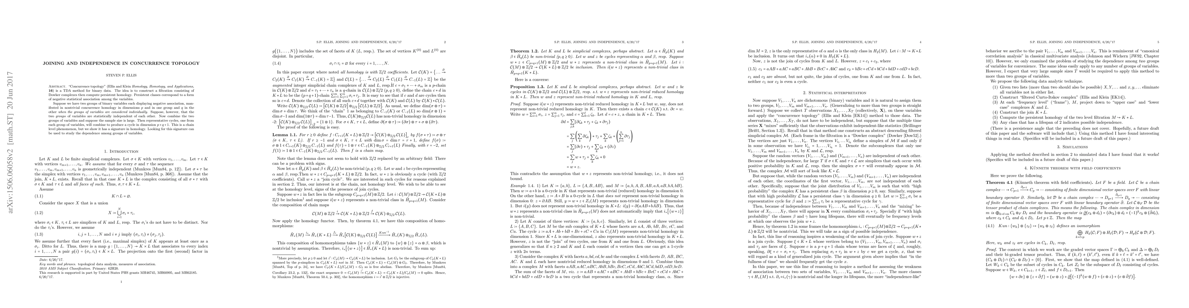 "Concurrence topology" (Ellis and Klein \emph{Homology, Homotopy, and Applications,} \textbf{16}) is a TDA method for binary data. The idea is to construct a filtration consisting of Dowker complexes then compute persistent homology. Persistent classes correspond to a form of negative statistical association among the variables. Suppose we have two groups of binary variables each displaying negative association, manifested in nontrivial concurrence homology in dimensions $p$ and in one group and $q$ in the other \emph{when the groups of variables are considered individually.} Suppose, however, that the two \emph{groups} of variables are statistically independent of each other. Now combine the two groups of variables and suppose the sample size is large. Then representative cycles, one from each group of variables, will combine to produce a cycle in dimension $p+q+1$. This is a chain level phenomenon, but we show it has a signature in homology. Looking for this signature can be used to study the dependence among groups of variables.