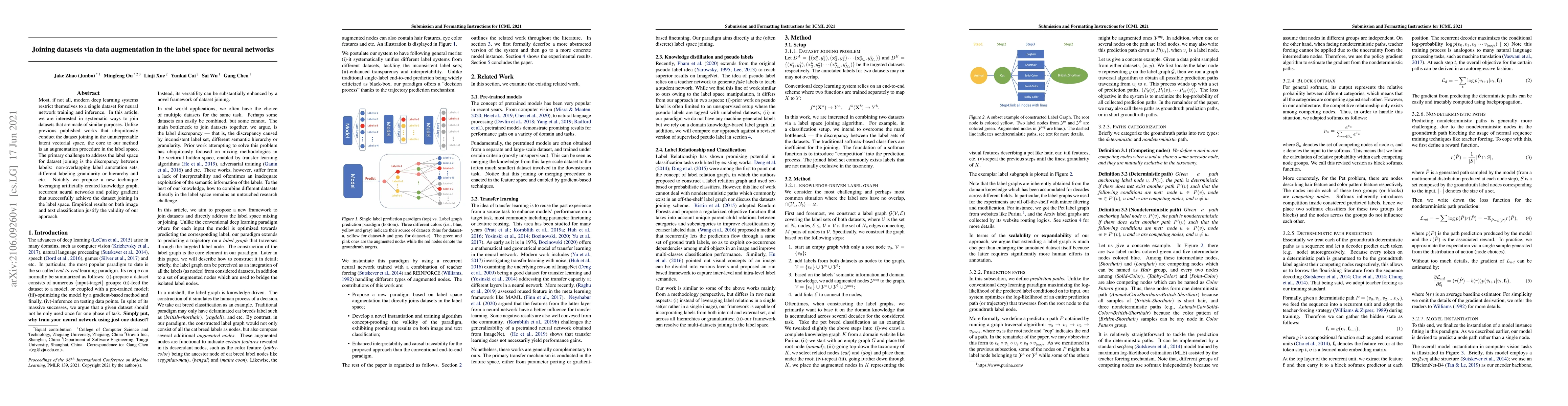Most, if not all, modern deep learning systems restrict themselves to a single dataset for neural network training and inference. In this article, we are interested in systematic ways to join datasets that are made of similar purposes. Unlike previous published works that ubiquitously conduct the dataset joining in the uninterpretable latent vectorial space, the core to our method is an augmentation procedure in the label space. The primary challenge to address the label space for dataset joining is the discrepancy between labels: non-overlapping label annotation sets, different labeling granularity or hierarchy and etc. Notably we propose a new technique leveraging artificially created knowledge graph, recurrent neural networks and policy gradient that successfully achieve the dataset joining in the label space. Empirical results on both image and text classification justify the validity of our approach.