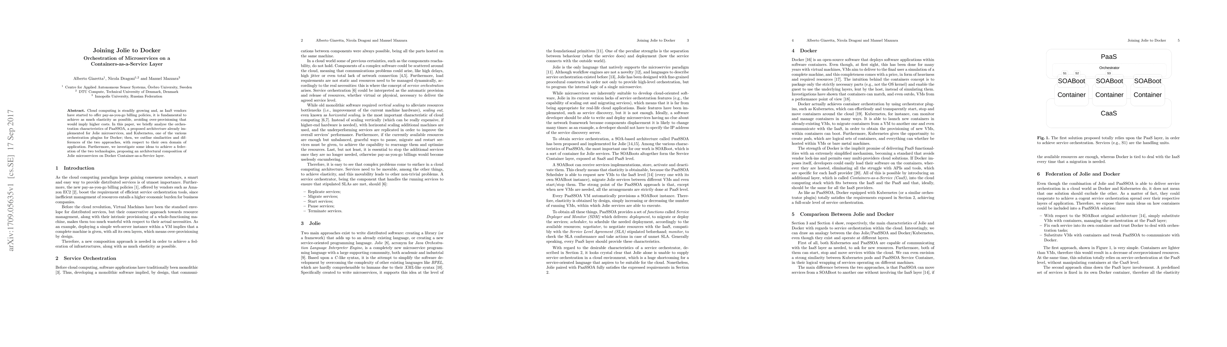 Cloud computing is steadily growing and, as IaaS vendors have started to offer pay-as-you-go billing policies, it is fundamental to achieve as much elasticity as possible, avoiding over-provisioning that would imply higher costs. In this paper, we briefly analyse the orchestration characteristics of PaaSSOA, a proposed architecture already implemented for Jolie microservices, and Kubernetes, one of the various orchestration plugins for Docker; then, we outline similarities and differences of the two approaches, with respect to their own domain of application. Furthermore, we investigate some ideas to achieve a federation of the two technologies, proposing an architectural composition of Jolie microservices on Docker Container-as-a-Service layer.
