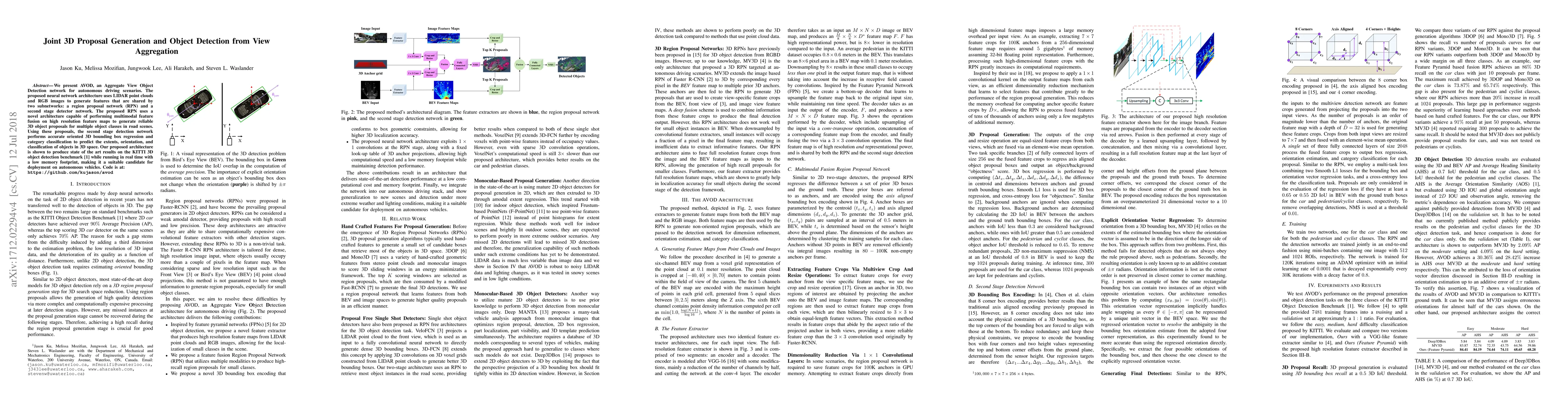 We present AVOD, an Aggregate View Object Detection network for autonomous driving scenarios. The proposed neural network architecture uses LIDAR point clouds and RGB images to generate features that are shared by two subnetworks: a region proposal network (RPN) and a second stage detector network. The proposed RPN uses a novel architecture capable of performing multimodal feature fusion on high resolution feature maps to generate reliable 3D object proposals for multiple object classes in road scenes. Using these proposals, the second stage detection network performs accurate oriented 3D bounding box regression and category classification to predict the extents, orientation, and classification of objects in 3D space. Our proposed architecture is shown to produce state of the art results on the KITTI 3D object detection benchmark while running in real time with a low memory footprint, making it a suitable candidate for deployment on autonomous vehicles. Code is at: https://github.com/kujason/avod