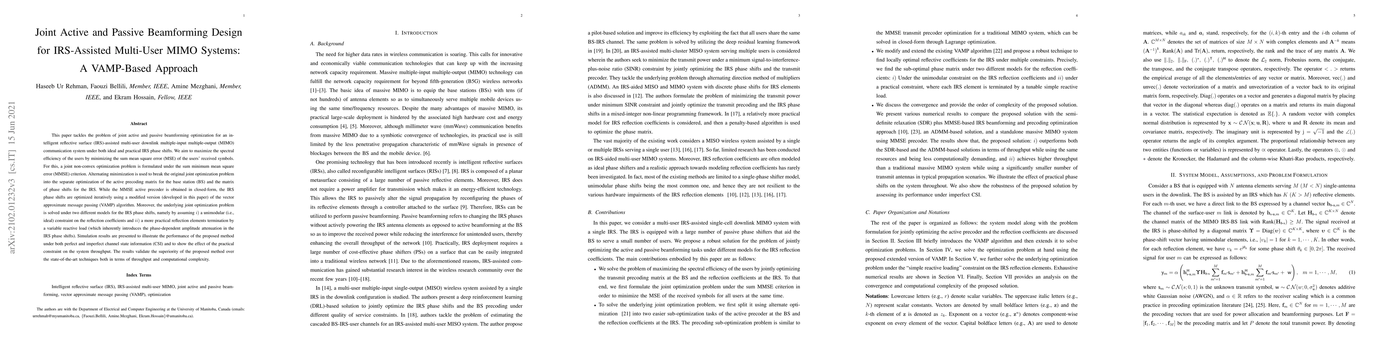 This paper proposes a VAMP-based approach for optimizing joint active and passive beamforming in IRS-assisted multi-user MIMO systems to maximize spectral efficiency by minimizing mean square error. The method uses block coordinate descent and a modified VAMP algorithm to iteratively find optimal solutions for both the active precoder and IRS phase shifters.