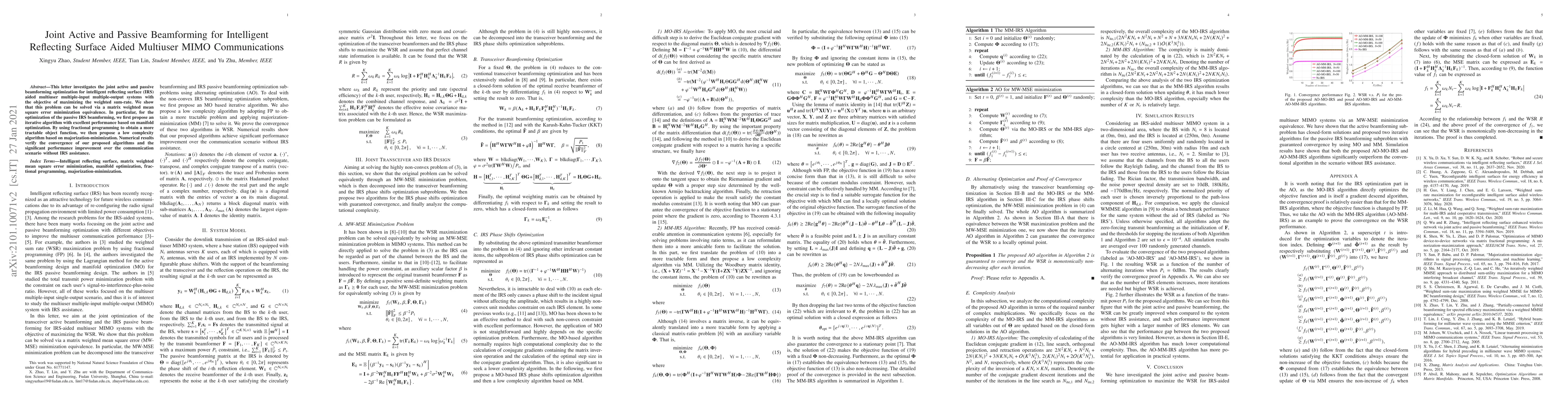 This paper proposes joint active and passive beamforming optimization for IRS-aided multiuser MIMO systems to maximize weighted sum-rate. It employs an iterative algorithm for passive IRS beamforming and a low complexity majorization-minimization method, demonstrating significant performance gains over scenarios without IRS assistance.