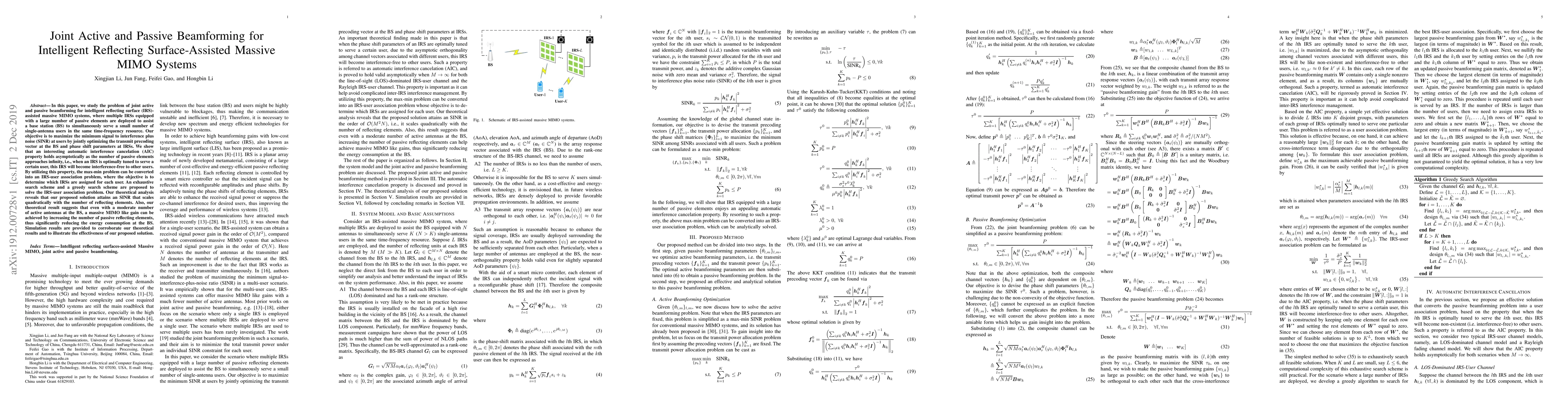 This paper investigates joint active and passive beamforming for IRS-assisted massive MIMO systems, aiming to maximize minimum SINR by optimizing BS precoding and IRS phase shifts. It reveals an automatic interference cancellation property, enabling conversion of the optimization problem into an IRS-user association task, solved using exhaustive and greedy search schemes.
