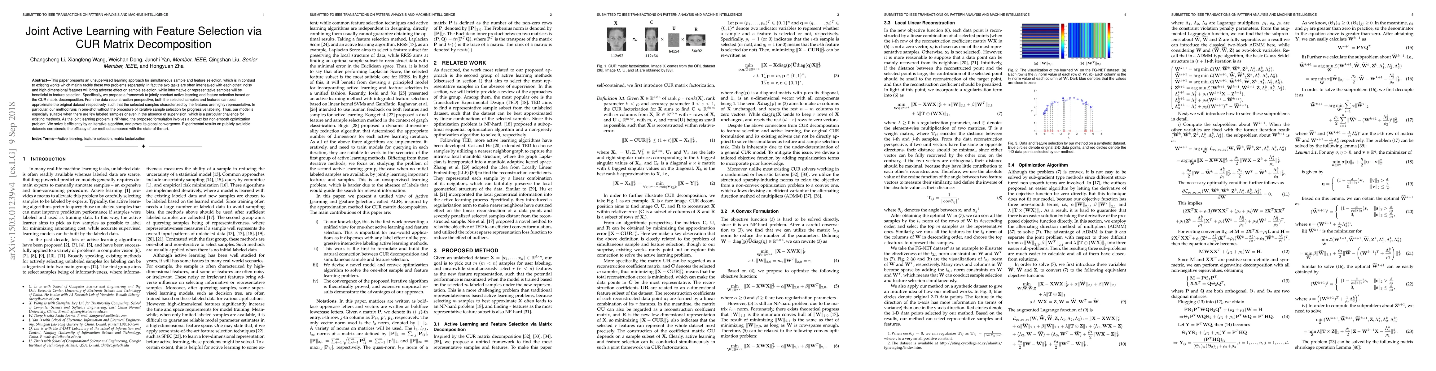 This paper proposes an unsupervised joint active learning and feature selection method using CUR matrix decomposition, addressing the interdependency between sample and feature selection. The method efficiently solves a non-smooth optimization problem and demonstrates superior performance on publicly available datasets compared to state-of-the-art approaches.
