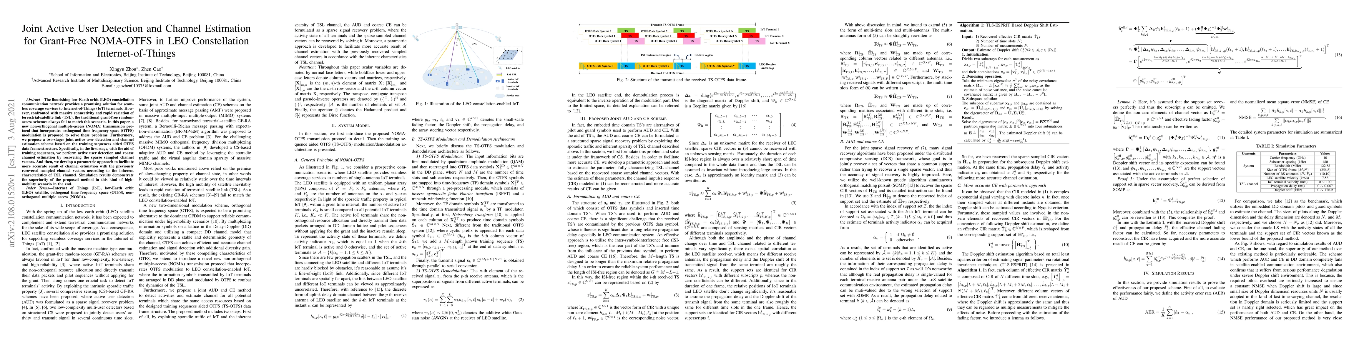 This paper proposes a novel NOMA-OTFS protocol for LEO constellation IoT networks to address massive connectivity and rapid link variations. It introduces a two-stage joint active user detection and channel estimation scheme using training sequences, achieving superior performance in high-mobility scenarios.