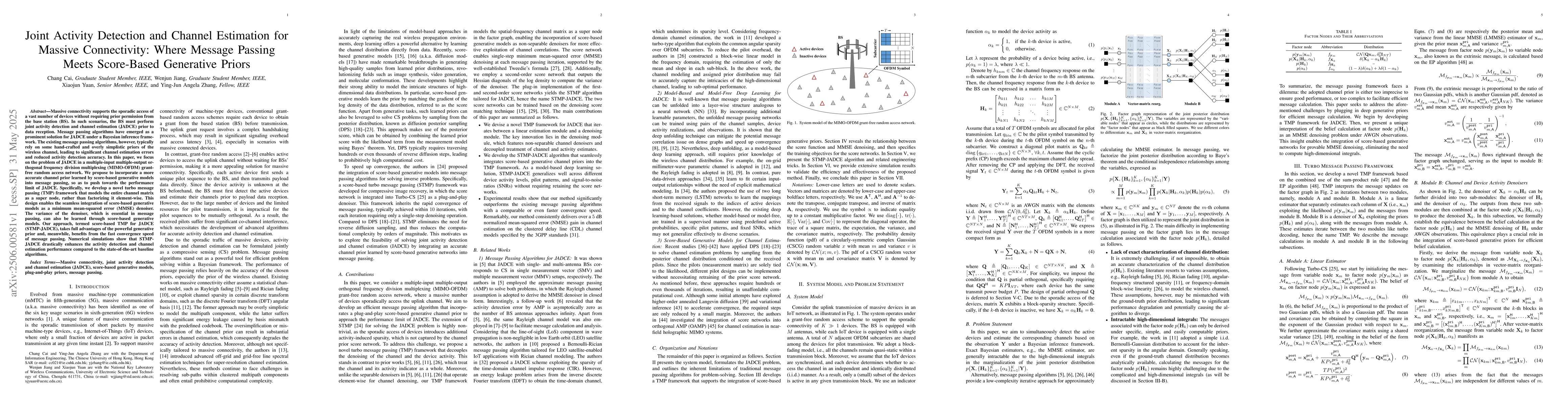 Researchers proposed a new method for joint activity detection and channel estimation in massive connectivity networks, combining score-based generative models with message passing algorithms to improve accuracy.