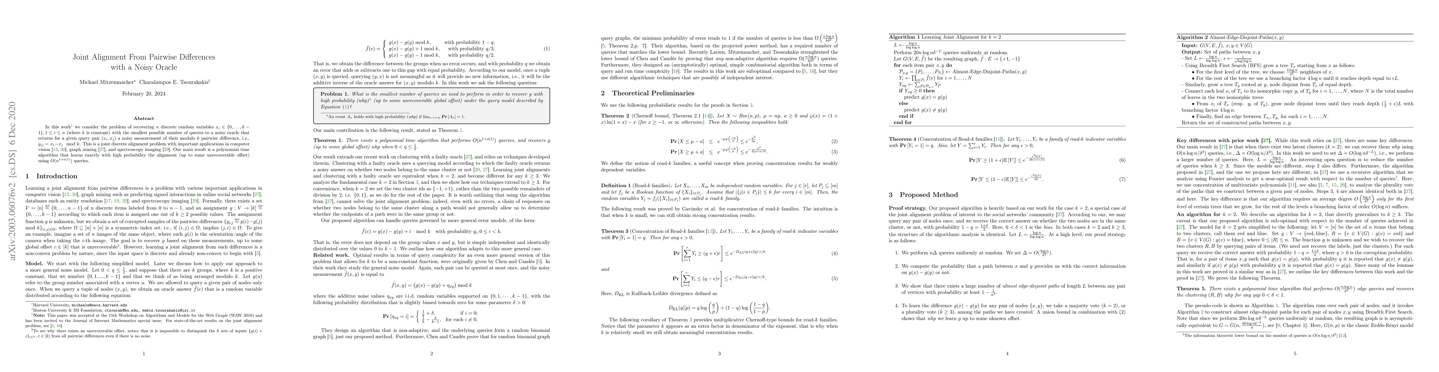 In this work we consider the problem of recovering $n$ discrete random variables $x_i\in \{0,\ldots,k-1\}, 1 \leq i \leq n$ (where $k$ is constant) with the smallest possible number of queries to a noisy oracle that returns for a given query pair $(x_i,x_j)$ a noisy measurement of their modulo $k$ pairwise difference, i.e., $y_{ij} = (x_i-x_j) \mod k$. This is a joint discrete alignment problem with important applications in computer vision, graph mining, and spectroscopy imaging. Our main result is a polynomial time algorithm that learns exactly with high probability the alignment (up to some unrecoverable offset) using $O(n^{1+o(1)})$ queries.