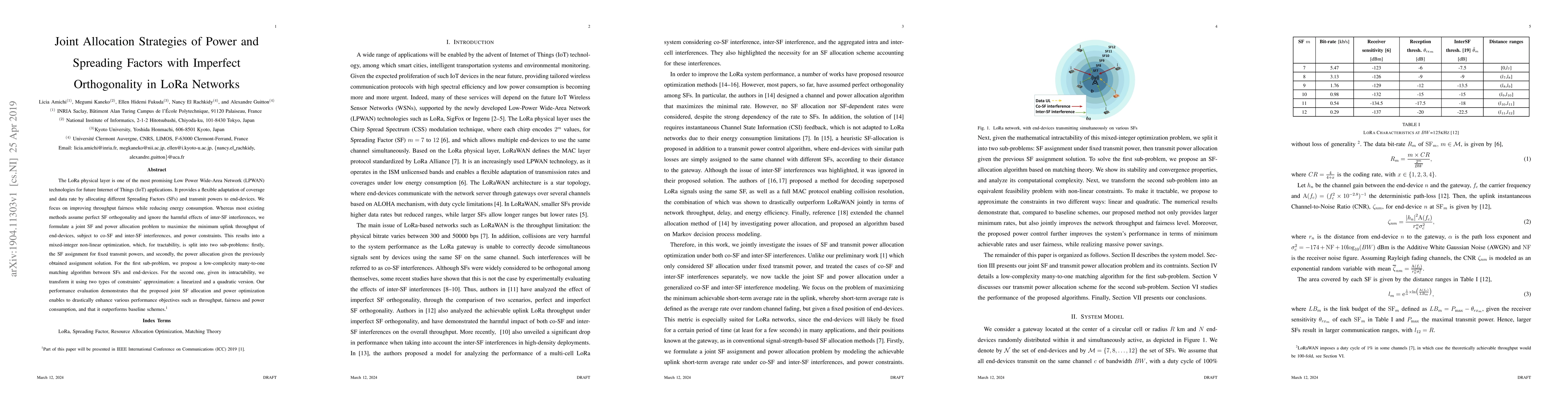 The LoRa physical layer is one of the most promising Low Power Wide-Area Network (LPWAN) technologies for future Internet of Things (IoT) applications. It provides a flexible adaptation of coverage and data rate by allocating different Spreading Factors (SFs) and transmit powers to end-devices. We focus on improving throughput fairness while reducing energy consumption. Whereas most existing methods assume perfect SF orthogonality and ignore the harmful effects of inter-SF interferences, we formulate a joint SF and power allocation problem to maximize the minimum uplink throughput of end-devices, subject to co-SF and inter-SF interferences, and power constraints. This results into a mixed-integer non-linear optimization, which, for tractability, is split into two sub-problems: firstly, the SF assignment for fixed transmit powers, and secondly, the power allocation given the previously obtained assignment solution. For the first sub-problem, we propose a low-complexity many-to-one matching algorithm between SFs and end-devices. For the second one, given its intractability, we transform it using two types of constraints approximation: a linearized and a quadratic version. Our performance evaluation demonstrates that the proposed joint SF allocation and power optimization enables to drastically enhance various performance objectives such as throughput, fairness and power consumption, and that it outperforms baseline schemes.