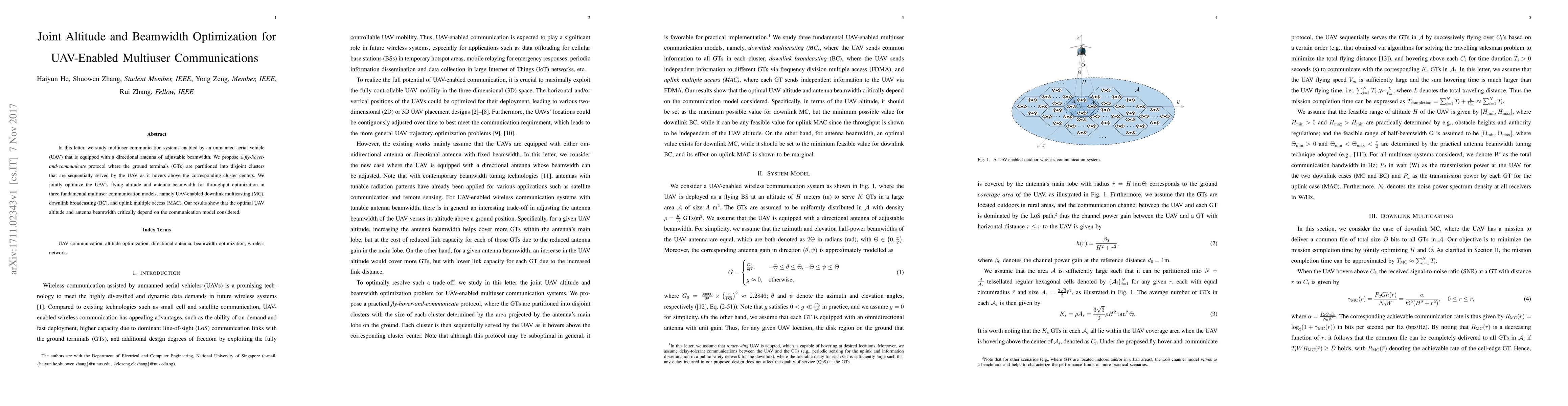 This paper proposes a fly-hover-and-communicate protocol for UAV-enabled multiuser communication systems, optimizing both UAV altitude and adjustable beamwidth for throughput in downlink multicasting, broadcasting, and uplink multiple access. The results indicate that optimal settings vary significantly based on the communication model.