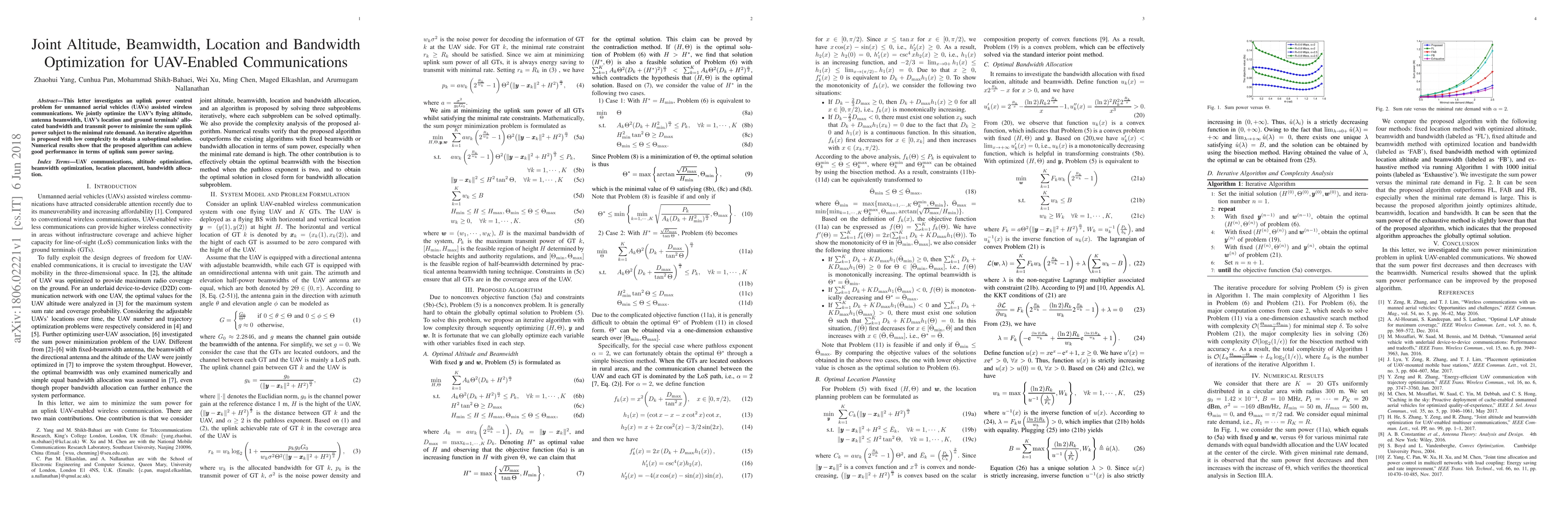 This paper optimizes UAV altitude, beamwidth, location, and bandwidth for UAV-enabled communications to minimize uplink power. An iterative algorithm achieves a suboptimal solution with low complexity, demonstrating significant power savings.