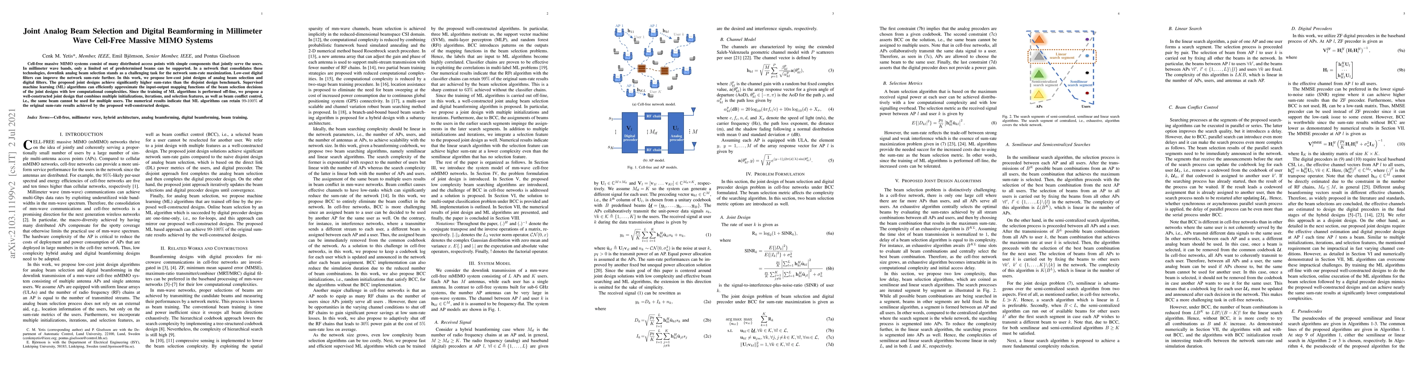 This paper proposes low-cost joint designs for analog beam selection and digital beamforming in millimeter wave cell-free massive MIMO systems, achieving higher sum-rates than separate designs. It employs supervised machine learning to efficiently approximate these designs with low computational complexity, retaining nearly 100% of the original sum-rate.