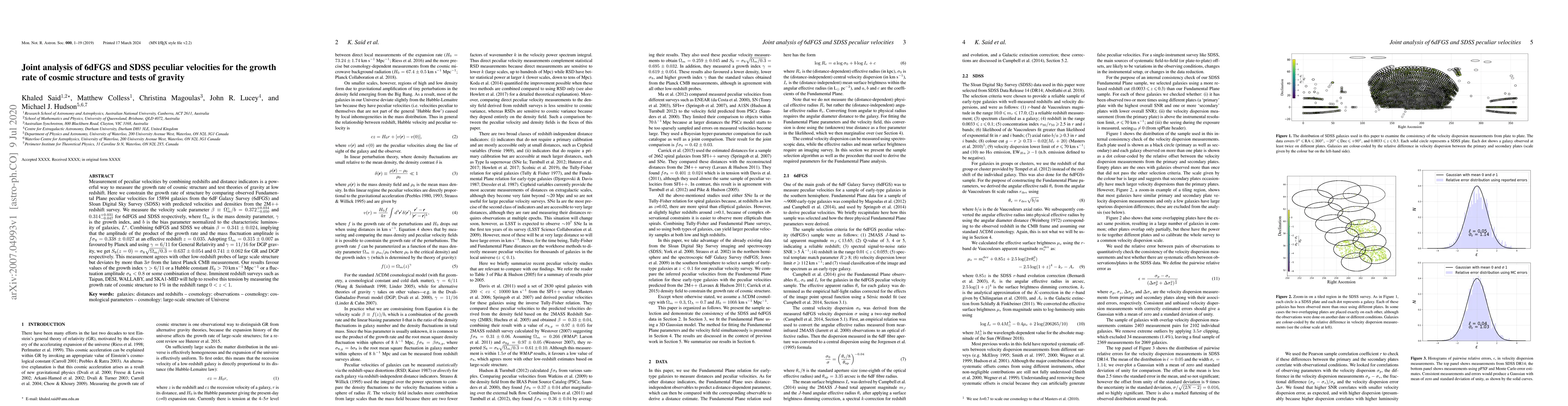 This paper combines peculiar velocities from the 6dFGS and SDSS surveys to measure the growth rate of cosmic structure and test gravity theories. The study finds $\beta=0.341\pm0.024$, indicating $f\sigma_8 = 0.338\pm0.027$ at $z=0.035$, and suggests tensions with Planck CMB measurements, favoring higher growth indices or a larger Hubble constant. Future surveys aim to resolve these discrepancies.