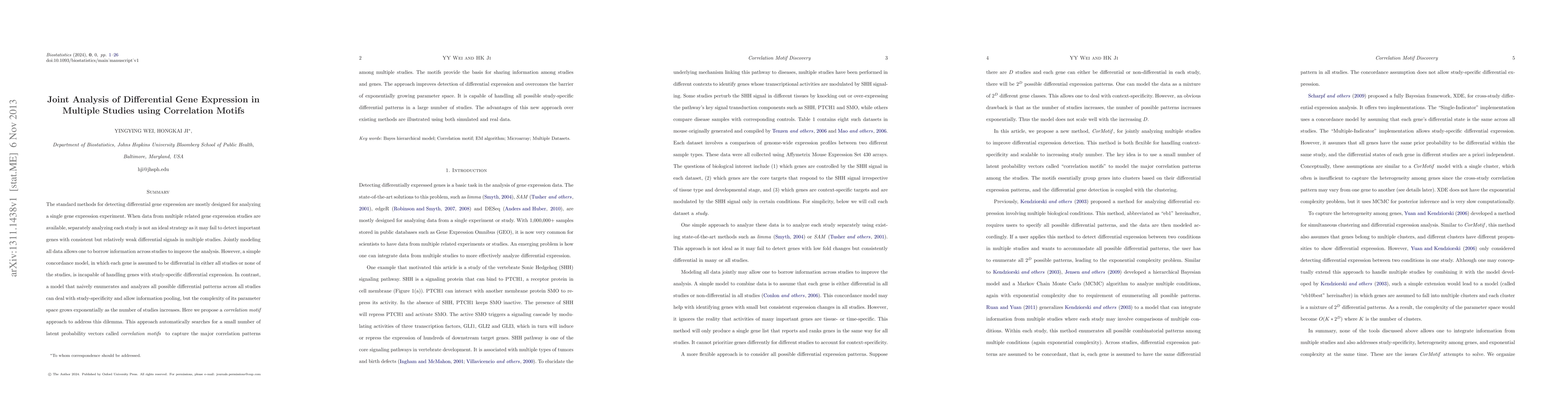 This paper proposes a "correlation motif" approach to jointly analyze differential gene expression across multiple studies, addressing the limitations of existing methods that fail to detect genes with weak but consistent signals. The method identifies latent probability vectors to capture major correlation patterns, enabling information sharing and improving detection while managing the complexity of study-specific differential expression.