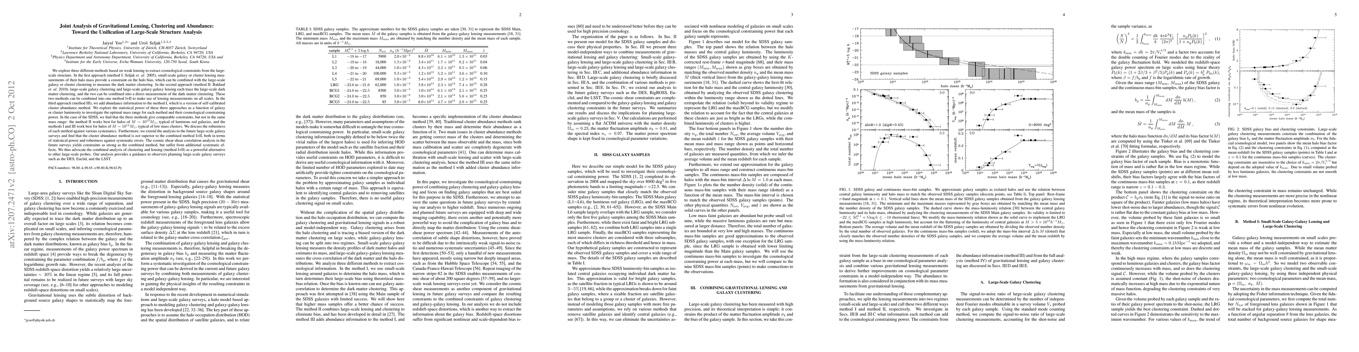 We explore three different methods based on weak lensing to extract cosmological constraints from the large-scale structure. In the first approach (method I), small-scale galaxy lensing measurements of their halo mass provide a constraint on the halo bias, which can be combined with the large-scale galaxy clustering to measure the dark matter clustering. In the second approach (method II), large-scale galaxy clustering and large-scale galaxy-galaxy lensing can be combined into a direct measurement of the dark matter clustering. These two methods can be combined into one method I+II to make use of lensing measurements on all scales. In the third approach (method III), we add abundance information to the method I. We explore the statistical power of these three approaches as a function of galaxy luminosity to investigate the optimal mass range for each method and their cosmological constraining power. In the case of the SDSS, we find that the three methods give comparable constraints, but not in the same mass range: the method II works best for halos of M~10^13 Msun, and the methods I and III work best for halos of M~10^14 Msun. We discuss the robustness of each method against various systematics. Furthermore, we extend the analysis to the future large-scale galaxy surveys and find that the cluster abundance method is not superior to the combined method I+II, both in terms of statistical power and robustness against systematic errors. The cosmic shear-shear correlation analysis in the future surveys yields constraints as strong as the combined method, but suffer from additional systematic effects. We thus advocate the combined analysis of clustering and lensing (method I+II) as a powerful alternative to other large-scale probes. Our analysis provides a guidance to observers planning large-scale galaxy surveys such as the DES, Euclid, and the LSST.