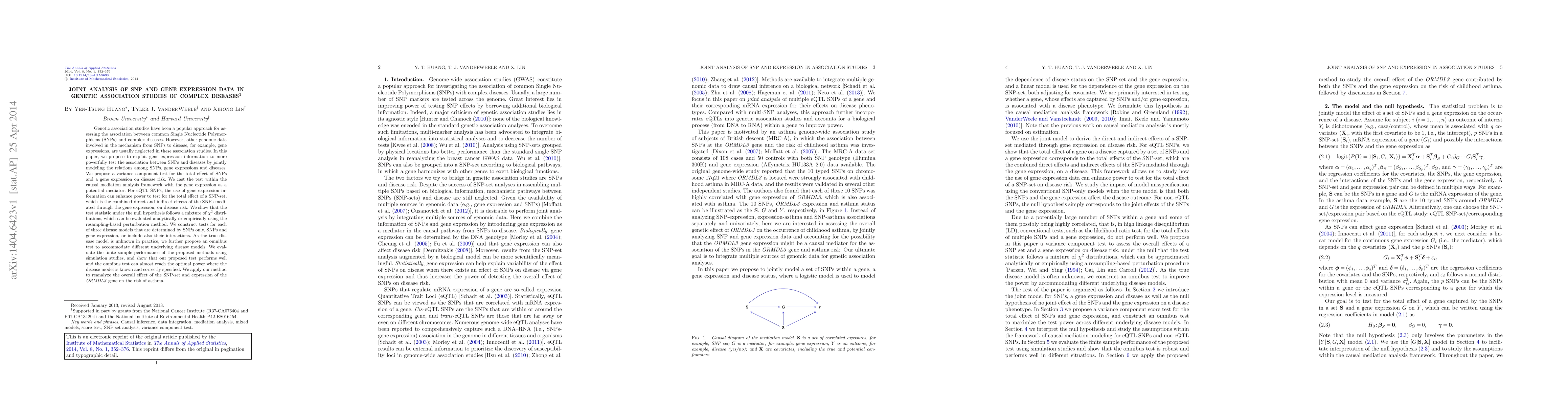 This paper proposes a method to enhance genetic association studies by jointly analyzing SNPs and gene expression data to better assess disease risk. It introduces a variance component test within a causal mediation framework, demonstrating improved power for eQTL SNPs and evaluating performance through simulations and an asthma risk analysis.
