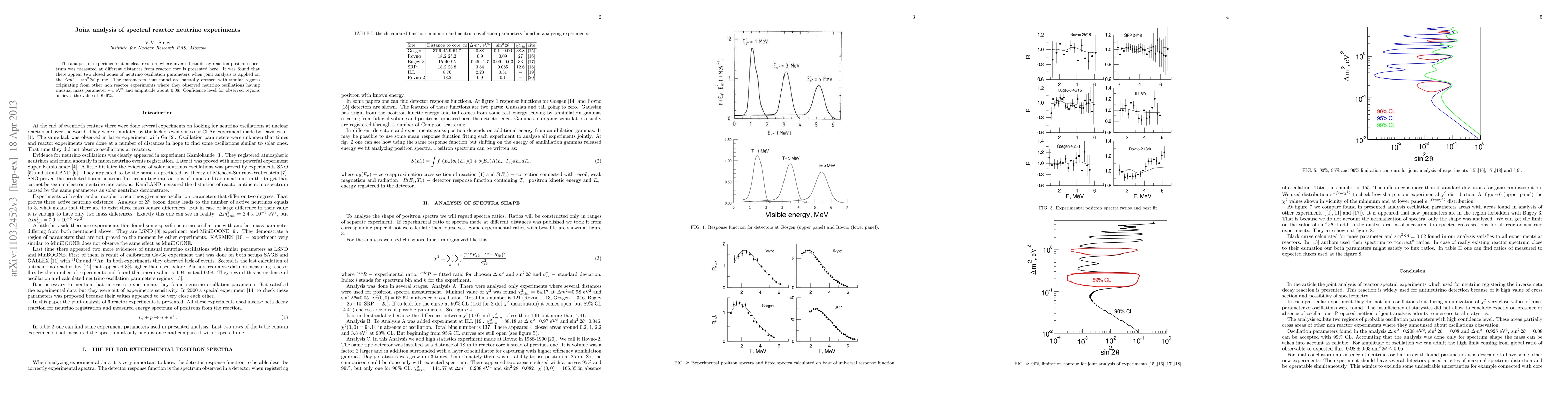The analysis of experiments at nuclear reactors where inverse beta decay reaction positron spectrum was measured at different distances from reactor core is presented here. It was found that there appear three enclosed zones of neutrino oscillation parameters when joint analysis is applied on the ${\Delta}m^{2}-\sin^{2}2{\theta}$ plane. The parameters that found are partially crossed with similar regions originating from other non reactor experiments where they observed neutrino oscillations having unusual mass parameter about 1 eV^2 and amplitude about 0.04. Confidence level for observed regions achieves the value of 99.9%.