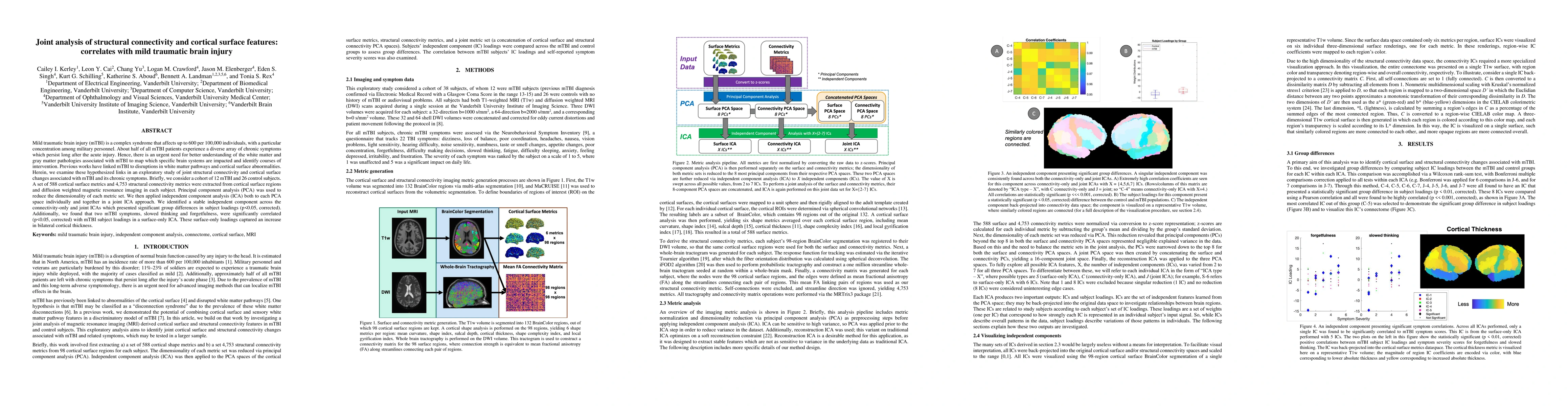 This study investigates structural connectivity and cortical surface features in individuals with mild traumatic brain injury (mTBI) compared to controls, identifying disruptions in white matter pathways and cortical surface abnormalities. A joint analysis using PCA and ICA revealed significant group differences and correlations between specific mTBI symptoms and cortical thickness changes.