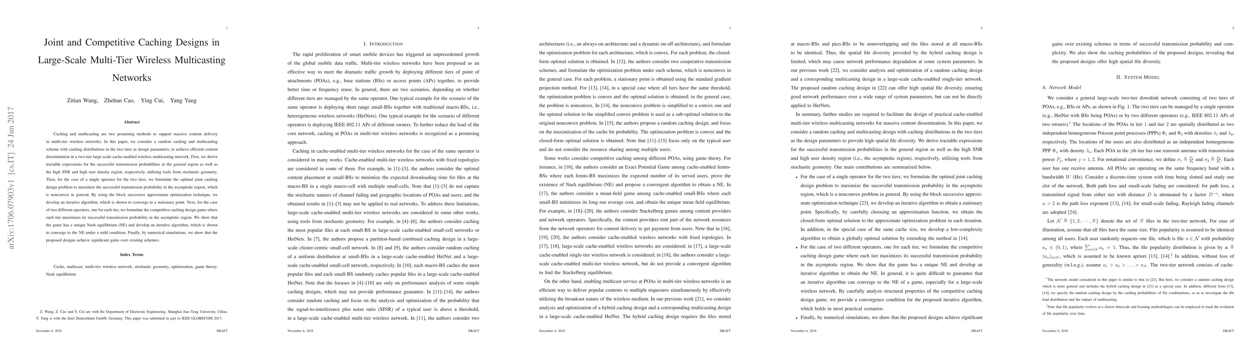 This paper investigates caching and multicasting strategies in large-scale multi-tier wireless networks, deriving expressions for successful transmission probabilities and developing optimization algorithms for joint and competitive caching designs under different operator scenarios. The proposed designs achieve significant performance improvements over existing methods.