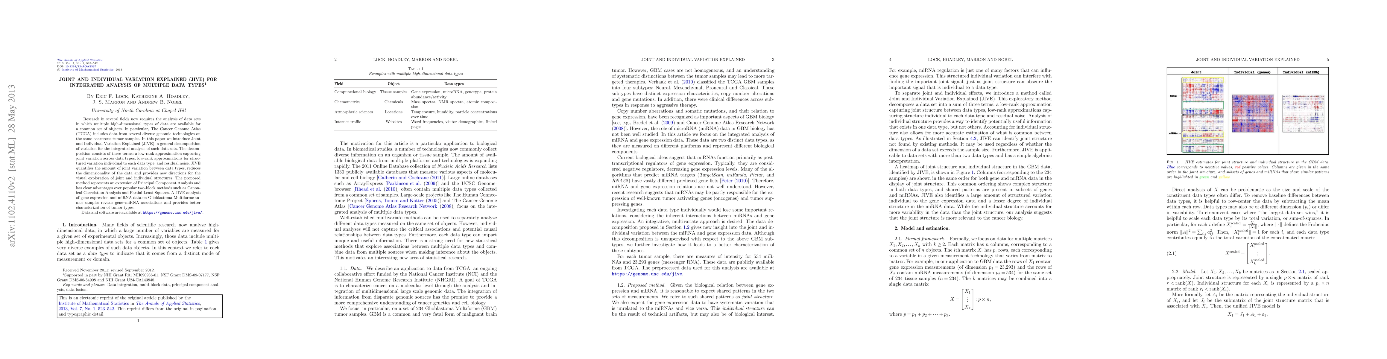 The paper introduces JIVE, a method for integrated analysis of multiple high-dimensional data types, capturing joint and individual variations across data sets. It extends PCA and outperforms methods like CCA and PLS, demonstrated through its application to TCGA's gene expression and miRNA data on Glioblastoma Multiforme tumors.