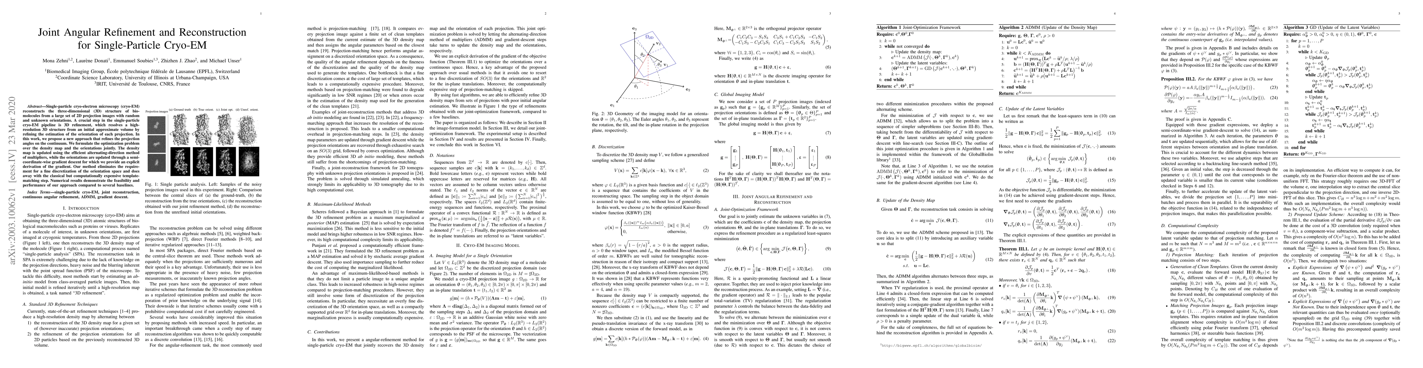 This paper proposes a new method for joint angular refinement and reconstruction in single-particle cryo-EM, refining projection angles on a continuum without discretizing orientation space. The approach optimizes the density map and orientations jointly, using efficient algorithms to update both, and demonstrates improved performance over traditional methods.