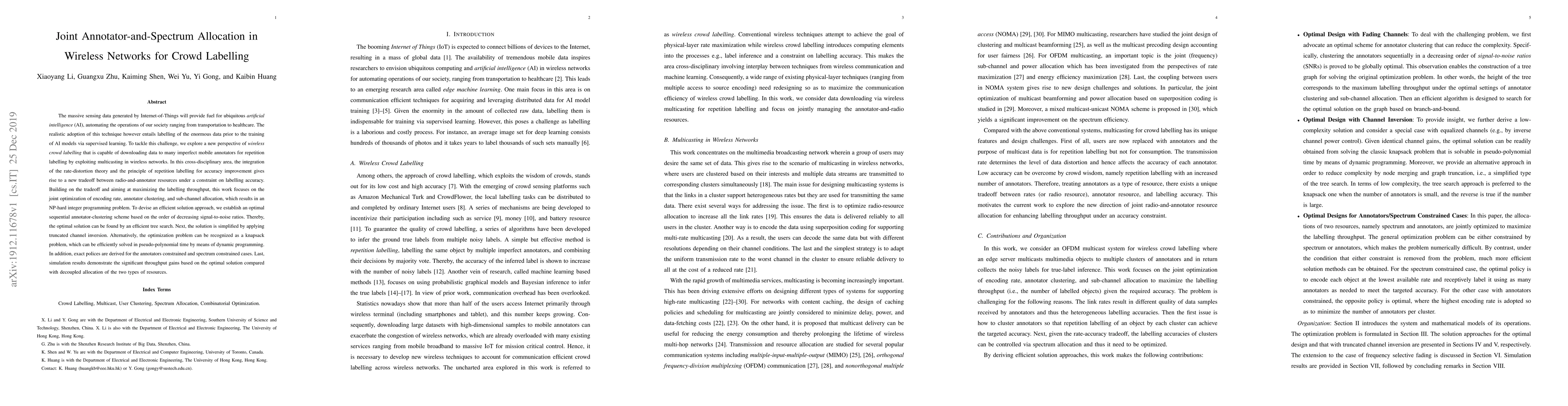 The massive sensing data generated by Internet-of-Things will provide fuel for ubiquitous artificial intelligence (AI), automating the operations of our society ranging from transportation to healthcare. The realistic adoption of this technique however entails labelling of the enormous data prior to the training of AI models via supervised learning. To tackle this challenge, we explore a new perspective of wireless crowd labelling that is capable of downloading data to many imperfect mobile annotators for repetition labelling by exploiting multicasting in wireless networks. In this cross-disciplinary area, the integration of the rate-distortion theory and the principle of repetition labelling for accuracy improvement gives rise to a new tradeoff between radio-and-annotator resources under a constraint on labelling accuracy. Building on the tradeoff and aiming at maximizing the labelling throughput, this work focuses on the joint optimization of encoding rate, annotator clustering, and sub-channel allocation, which results in an NP-hard integer programming problem. To devise an efficient solution approach, we establish an optimal sequential annotator-clustering scheme based on the order of decreasing signal-to-noise ratios. Thereby, the optimal solution can be found by an efficient tree search. Next, the solution is simplified by applying truncated channel inversion. Alternatively, the optimization problem can be recognized as a knapsack problem, which can be efficiently solved in pseudo-polynomial time by means of dynamic programming. In addition, exact polices are derived for the annotators constrained and spectrum constrained cases. Last, simulation results demonstrate the significant throughput gains based on the optimal solution compared with decoupled allocation of the two types of resources.