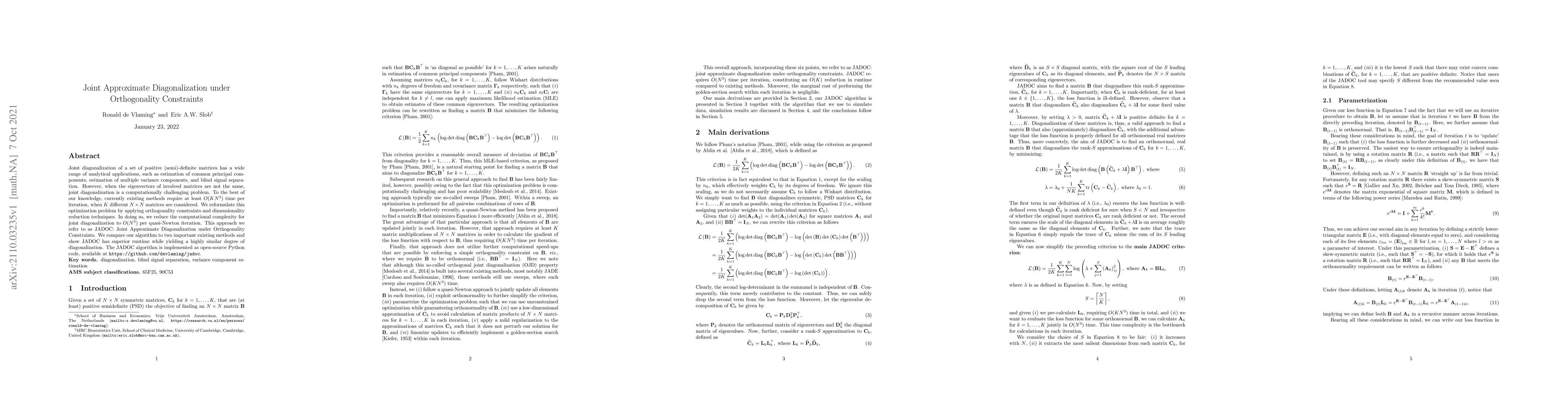 This paper proposes JADOC, a method for joint approximate diagonalization of positive (semi)-definite matrices under orthogonality constraints, reducing computational complexity to $O(N^3)$ per iteration. JADOC outperforms existing methods in runtime while maintaining similar diagonalization accuracy.