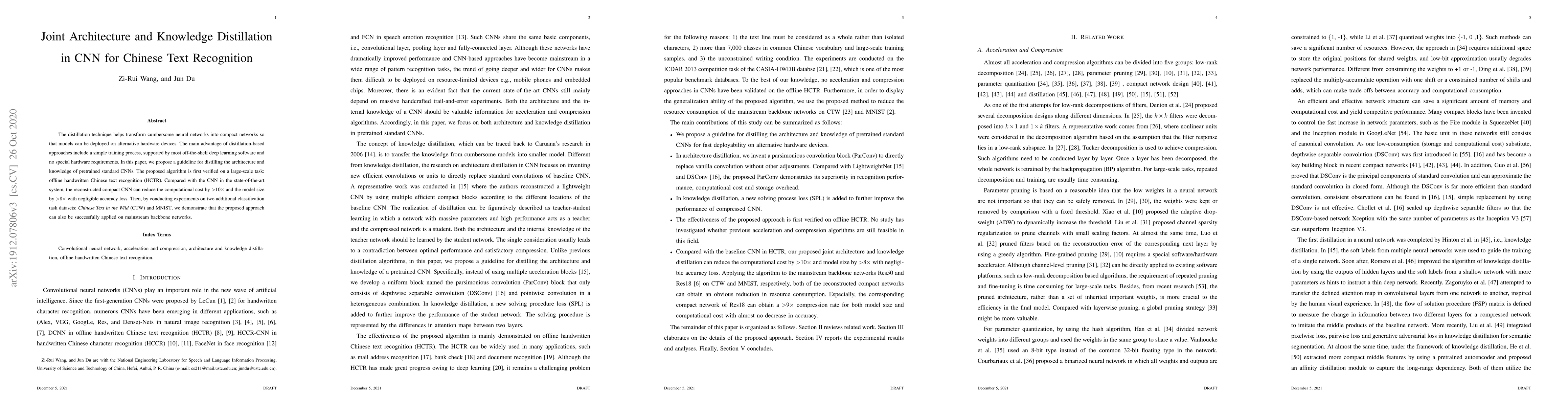 This paper proposes a method to simultaneously distill the architecture and knowledge of pre-trained CNNs for efficient Chinese text recognition. By analyzing computational cost and storage overhead, optional strategies compress fully-connected layers, replacing vanilla convolution layers with a parsimonious convolution (ParConv) block. Knowledge distillation with multiple losses further enhances performance. The approach reduces computational cost by over 10x and model size by over 8x on offline handwritten Chinese text recognition, with minimal accuracy loss. It also demonstrates applicability on mainstream backbone networks like MNIST.