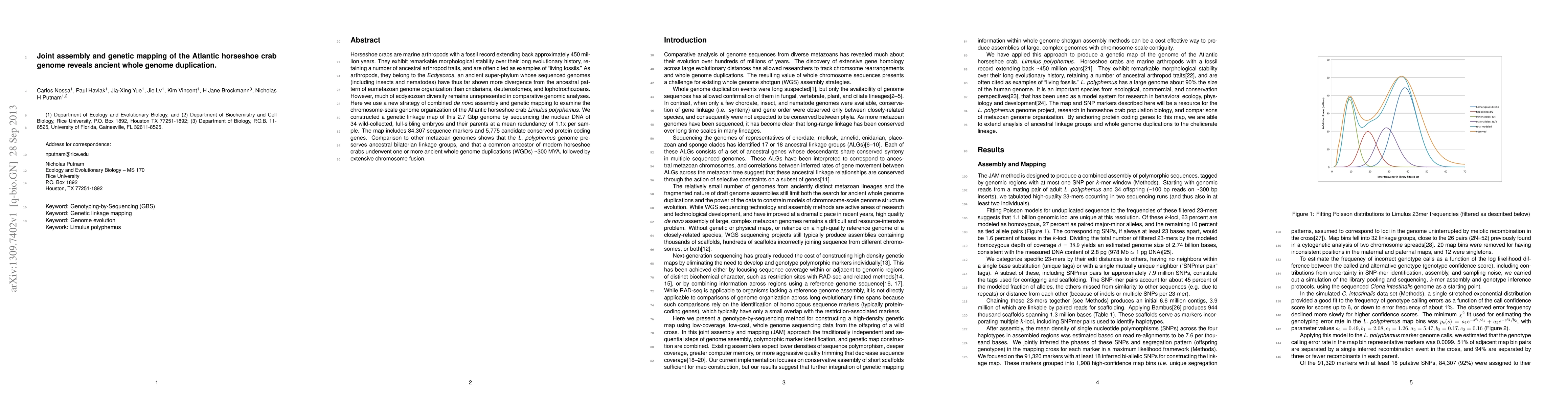 This research assembles and maps the Atlantic horseshoe crab genome, revealing ancient whole genome duplications (WGDs) that occurred around 300 million years ago, providing insights into the evolutionary history of ecdysozoans and their ancestral genome organization. The study highlights horseshoe crabs as "living fossils" with significant genomic stability.