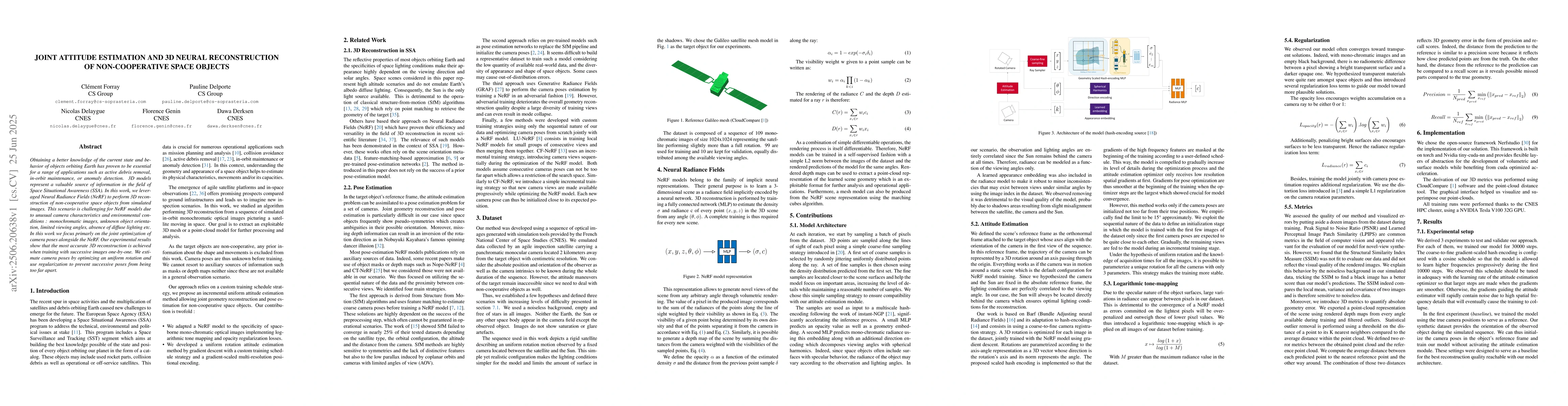 Obtaining a better knowledge of the current state and behavior of objects orbiting Earth has proven to be essential for a range of applications such as active debris removal, in-orbit maintenance, or anomaly detection. 3D models represent a valuable source of information in the field of Space Situational Awareness (SSA). In this work, we leveraged Neural Radiance Fields (NeRF) to perform 3D reconstruction of non-cooperative space objects from simulated images. This scenario is challenging for NeRF models due to unusual camera characteristics and environmental conditions : mono-chromatic images, unknown object orientation, limited viewing angles, absence of diffuse lighting etc. In this work we focus primarly on the joint optimization of camera poses alongside the NeRF. Our experimental results show that the most accurate 3D reconstruction is achieved when training with successive images one-by-one. We estimate camera poses by optimizing an uniform rotation and use regularization to prevent successive poses from being too far apart.