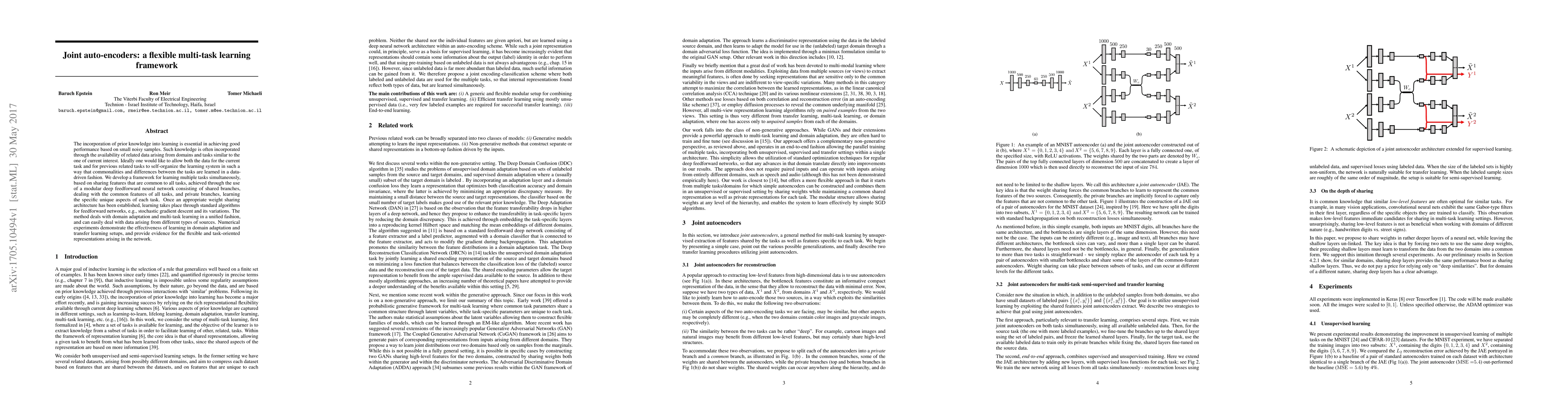 The incorporation of prior knowledge into learning is essential in achieving good performance based on small noisy samples. Such knowledge is often incorporated through the availability of related data arising from domains and tasks similar to the one of current interest. Ideally one would like to allow both the data for the current task and for previous related tasks to self-organize the learning system in such a way that commonalities and differences between the tasks are learned in a data-driven fashion. We develop a framework for learning multiple tasks simultaneously, based on sharing features that are common to all tasks, achieved through the use of a modular deep feedforward neural network consisting of shared branches, dealing with the common features of all tasks, and private branches, learning the specific unique aspects of each task. Once an appropriate weight sharing architecture has been established, learning takes place through standard algorithms for feedforward networks, e.g., stochastic gradient descent and its variations. The method deals with domain adaptation and multi-task learning in a unified fashion, and can easily deal with data arising from different types of sources. Numerical experiments demonstrate the effectiveness of learning in domain adaptation and transfer learning setups, and provide evidence for the flexible and task-oriented representations arising in the network.