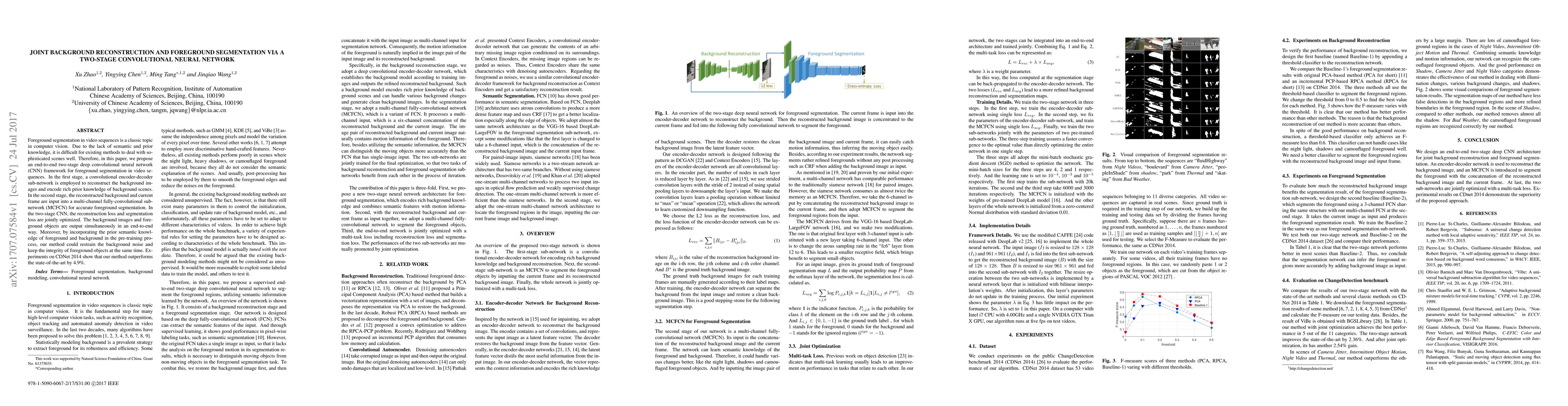 This paper proposes a two-stage CNN framework for accurate foreground segmentation in video sequences by first reconstructing the background and then segmenting the foreground. The method outperforms existing techniques by 4.9% on CDNet 2014, leveraging joint optimization of reconstruction and segmentation losses.