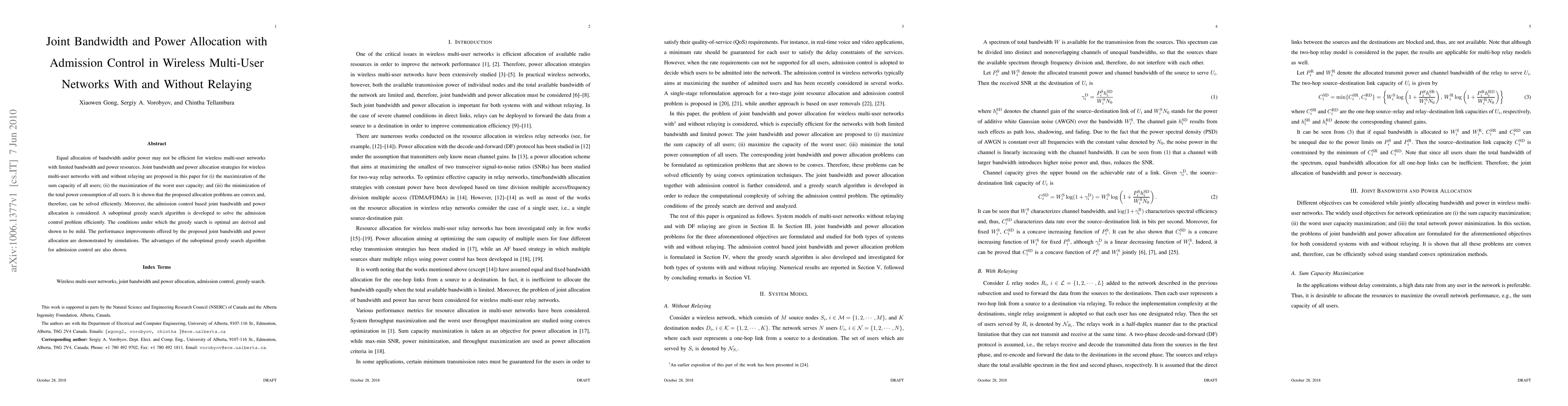 This paper proposes joint bandwidth and power allocation strategies for wireless multi-user networks, aiming to maximize sum capacity, worst user capacity, and minimize total power consumption. It introduces a suboptimal greedy search algorithm for efficient admission control, demonstrating performance improvements through simulations.