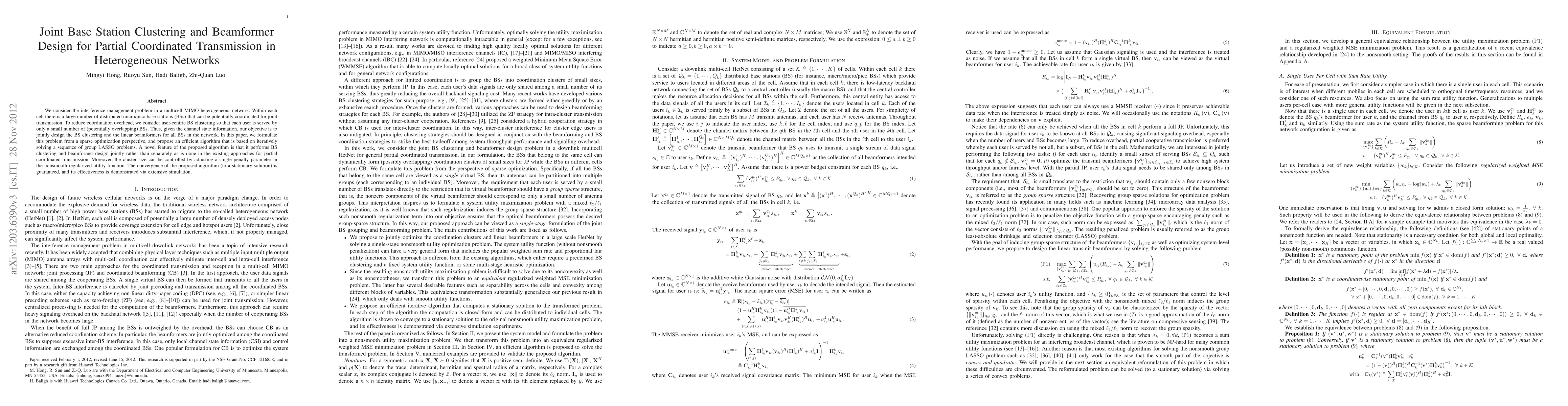 We consider the interference management problem in a multicell MIMO heterogenous network. Within each cell there are a large number of distributed micro/pico base stations (BSs) that can be potentially coordinated for joint transmission. To reduce coordination overhead, we consider user-centric BS clustering so that each user is served by only a small number of (potentially overlapping) BSs. Thus, given the channel state information, our objective is to jointly design the BS clustering and the linear beamformers for all BSs in the network. In this paper, we formulate this problem from a {sparse optimization} perspective, and propose an efficient algorithm that is based on iteratively solving a sequence of group LASSO problems. A novel feature of the proposed algorithm is that it performs BS clustering and beamformer design jointly rather than separately as is done in the existing approaches for partial coordinated transmission. Moreover, the cluster size can be controlled by adjusting a single penalty parameter in the nonsmooth regularized utility function. The convergence of the proposed algorithm (to a local optimal solution) is guaranteed, and its effectiveness is demonstrated via extensive simulation.