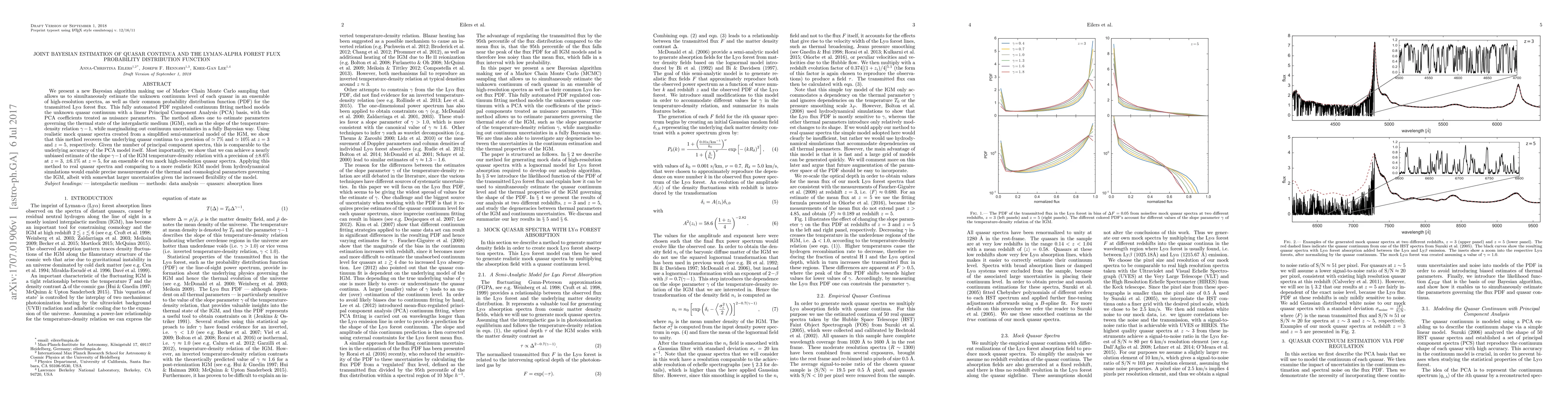 This paper introduces a new Bayesian algorithm using Markov Chain Monte Carlo sampling to estimate the quasar continua and the probability distribution function of the Lyman-Alpha forest flux. The method employs PCA to model the quasar continuum and achieves precise recovery of continua and nearly unbiased estimates of the IGM temperature-density relation slope.