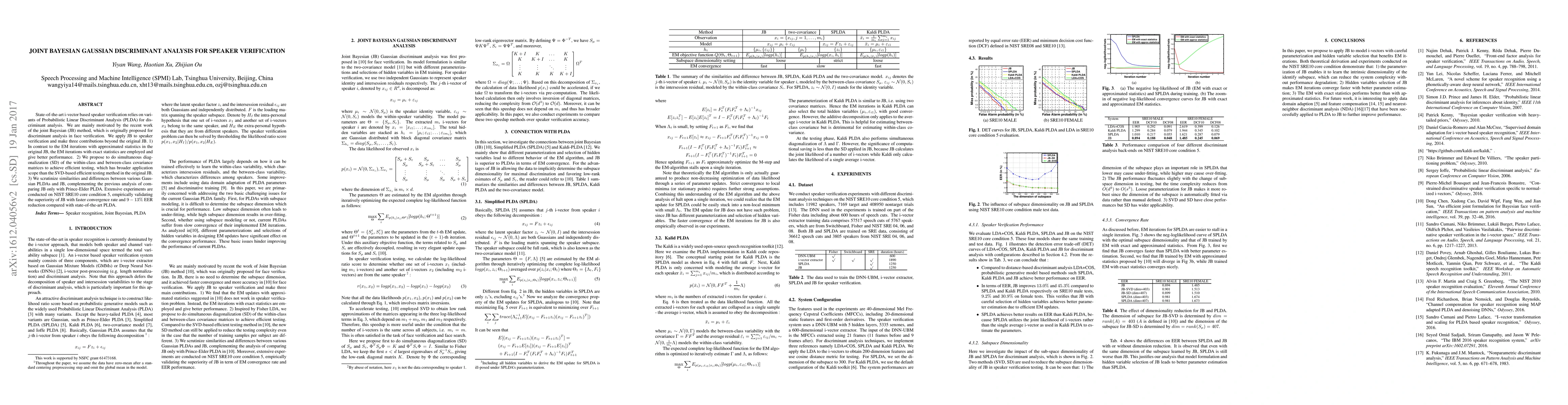 This paper proposes a joint Bayesian Gaussian discriminant analysis for speaker verification using an improved EM algorithm with exact statistics and simultaneous diagonalization for efficient testing. Experiments show a 9-13% reduction in Equal Error Rate compared to state-of-the-art PLDA methods.